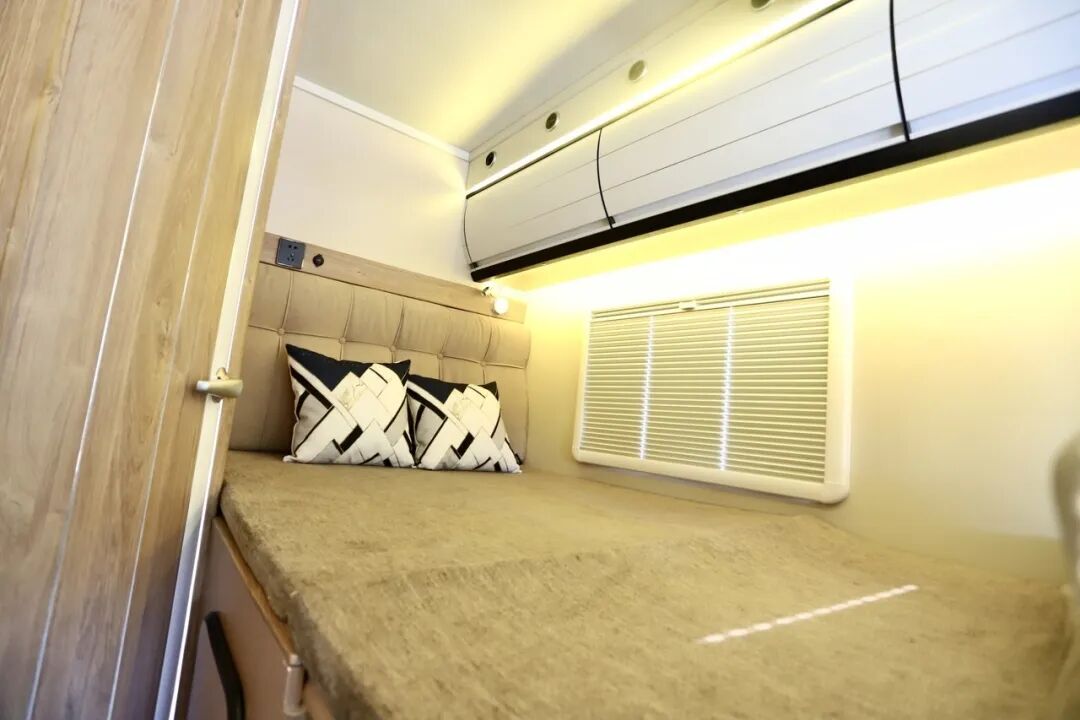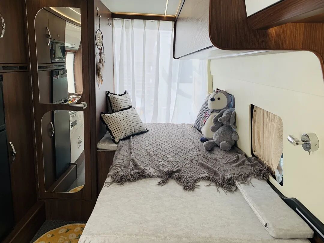 ● 后方休息区设置了一张单人床,可根据个人需求拓展成1300x1950mm双人床。会客区上方还配有电动吊床,增加车内休息空间;