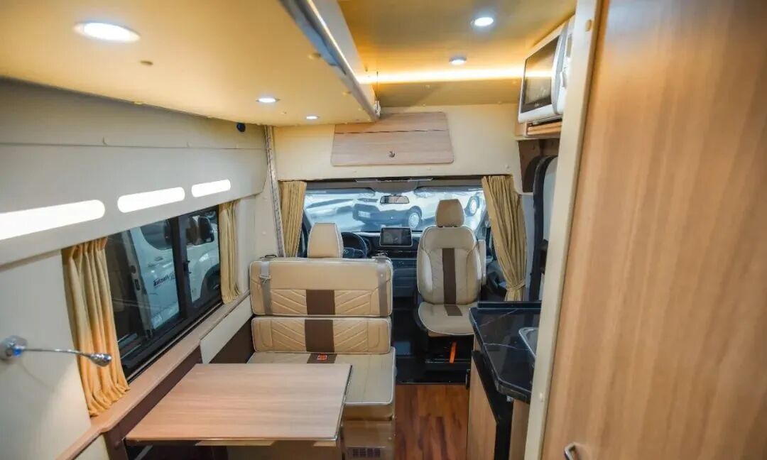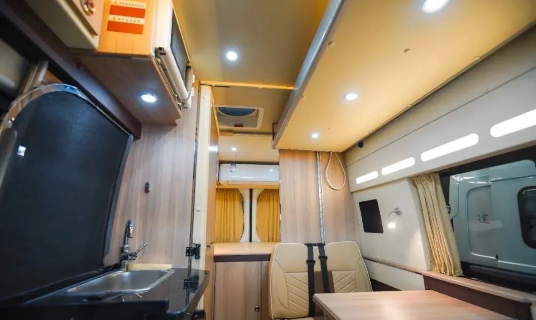 ● U型卡座式设计的会客区,可拼成一张1900x1700mm大床,车身主驾一侧还可以加装一张上铺,上铺可拆卸、可拓展,不拓展时尺寸为1900x800mm,拓展后为1900x1300mm;