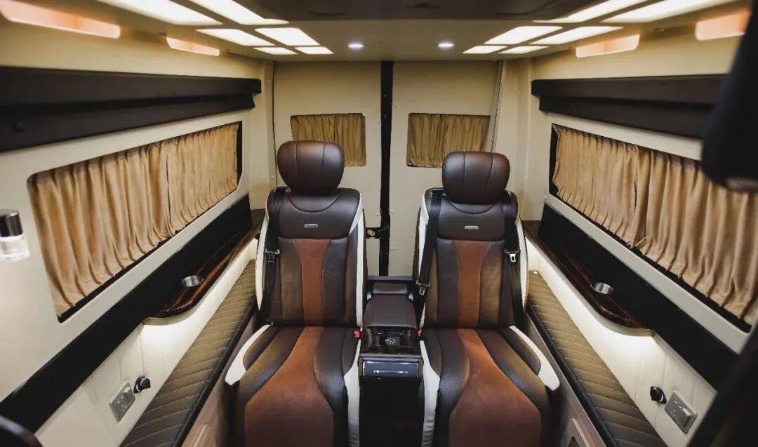 ● 会客区配有双人座椅和一张单人座椅,驻车时可将座椅向前抽拉并放下靠背拼成一张1900x1700mm双人床;