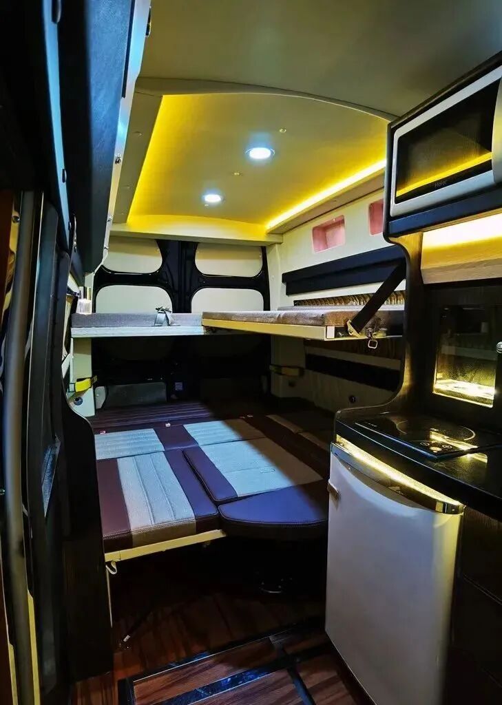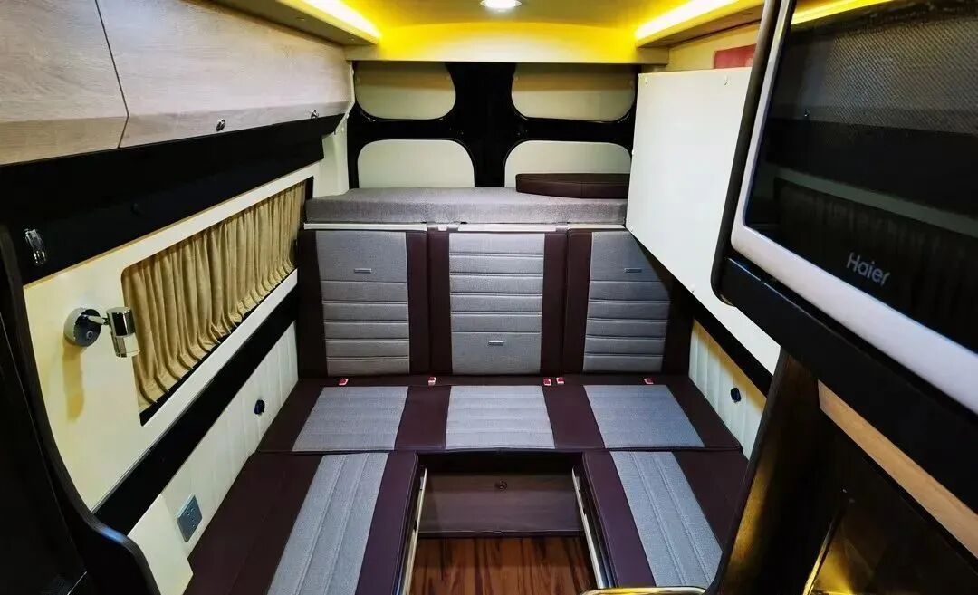 ● 车内设置了三张独立床位,包括中部900x1900mm卡座拼床、上部900x1900mm电动升降床、2000x1400mm后置床,休息空间丰富;