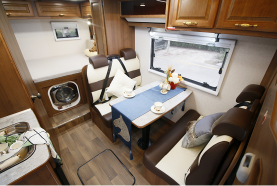 额头休息区后方是会客区,采用对座式汽车座椅造型设计,可满足多人乘坐休息;座椅还设有安全带,用于保障行车时乘坐的安全;中间位置配备了可升降餐桌,可与卡座拼床,作为休息区使用。