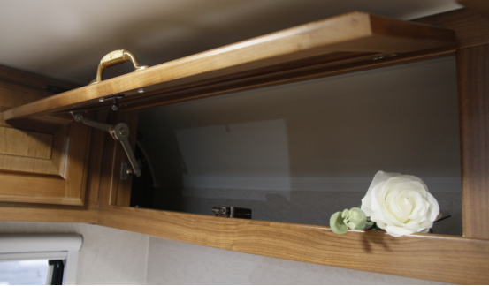 卡座上方设有折叠式小吊柜,可以存放一些日常用品;柜门装有复古黄铜把手,和车内美式风格呼应,保证车内空间的整体性。