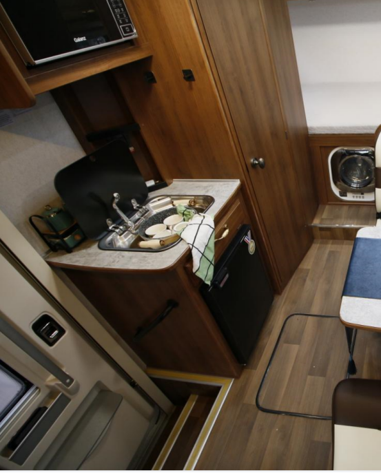 厨房区采用一体式橱柜设计,功能配置齐全,配备了洗菜池、微波炉、独立水龙头、房车专用冰箱等设施,可满足日常烹饪需求;台面下方有一个抽屉,可以用来存放厨房用品。