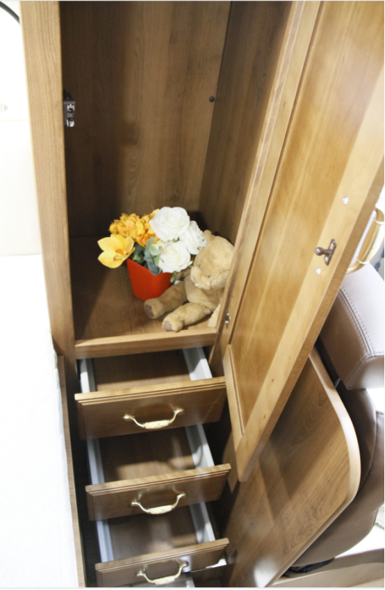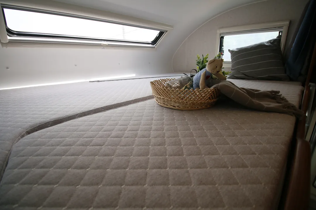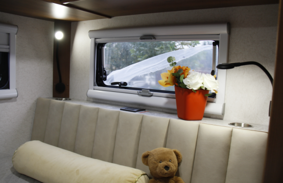 车尾休息区横置卧铺床,供日常休息使用;床的两侧均设有外推窗,可用于欣赏车外风景,打开后也能加快车内空气流通;顶部配有吊柜,可存放日常用品;下方配有房车专用洗衣机,轻松解决旅行洗衣问题。