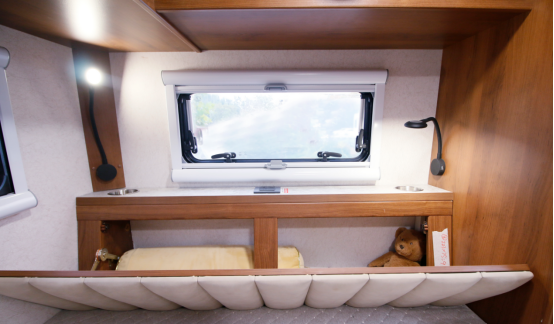 卧铺床还配有床头柜和储物台,增加了车内的储物空间;储物台上配有五孔插座、阅读灯,方便日常生活。