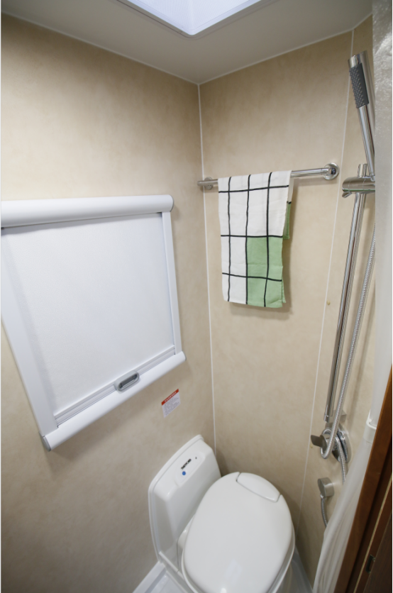 卫浴区采用干湿一体设计,内部配备盒式座便器、顶部换气扇、淋浴花洒、梳妆镜、毛巾架等,可满足日常洗漱、盥洗需求;马桶上方设有一个窗户,方便日常通风换气。