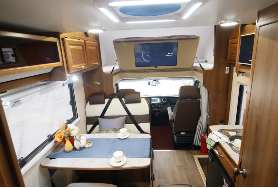 进入生活区,可以看到整车内饰采用了高端大气又不失稳重的美式设计风格,家具采用北美进口樱桃木实木家具,天然、无污染,更符合现代人环保、健康的生活理念。