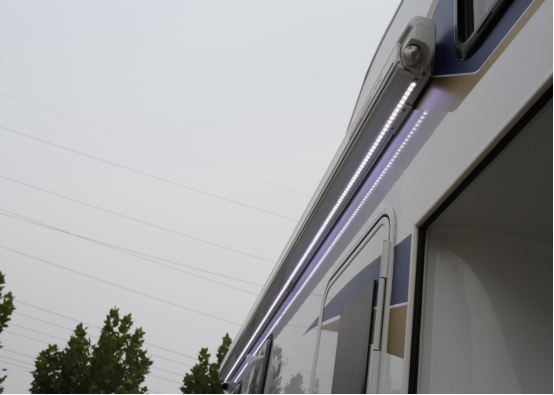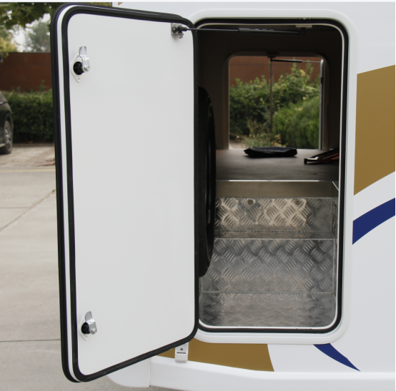 车厢部分,巨威美式后横床房车采用保温隔热效果良好的三明治复合式结构(FRP外墙板),非常适合户外旅行;车身外部配有3m进口菲亚玛遮阳棚,附带彩色氛围灯带,增添旅行生活乐趣;另外,车身外部还配有注水口、市电接口、电动踏步、房车专用乘车门等设施,保障了户外生活的基本需求。