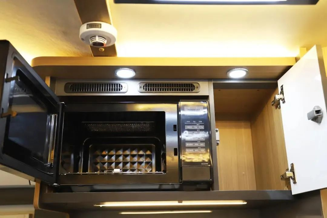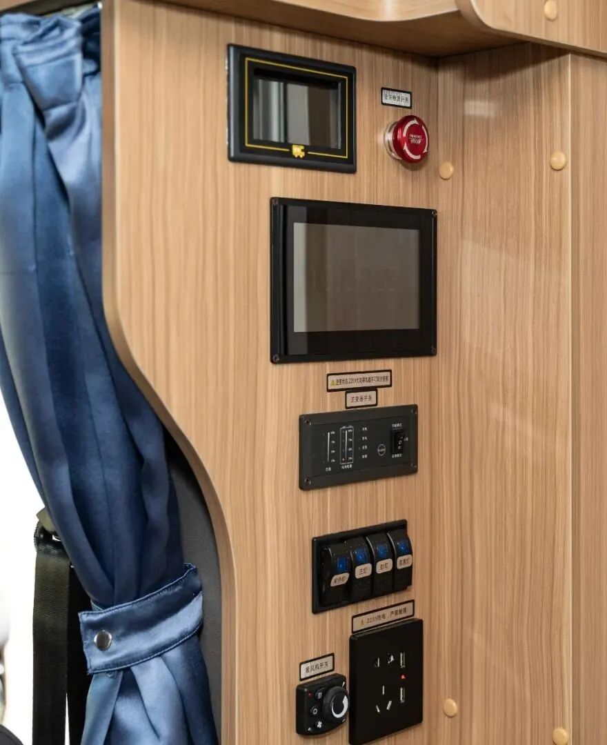 厨房区左侧设有水电控制系统和灯光、暖风控制开关,可实时调控车内水电、照明等设施。