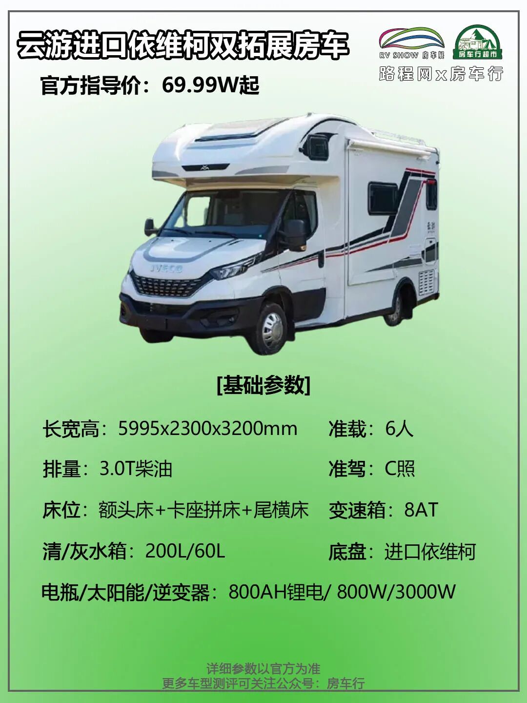 和国产依维柯底盘相比,进口依维柯底盘动力表现、驾驶体验更佳,所以很多车友更青睐进口依维柯底盘打造的房车,但进口依维柯房车的价格动辄百万上下,低于80W的更是罕见,让人直呼爱不起!不过今天小编给大家带来的这款云游进口依维柯双拓展房车,官方指导价69.99W起,性价比超高。除了高性价比外,这款房车还采用全铝车身,车身左侧、后方还设置了拓展舱,车内空间更加宽敞,适合多人外出旅行,下面一起来看看吧。