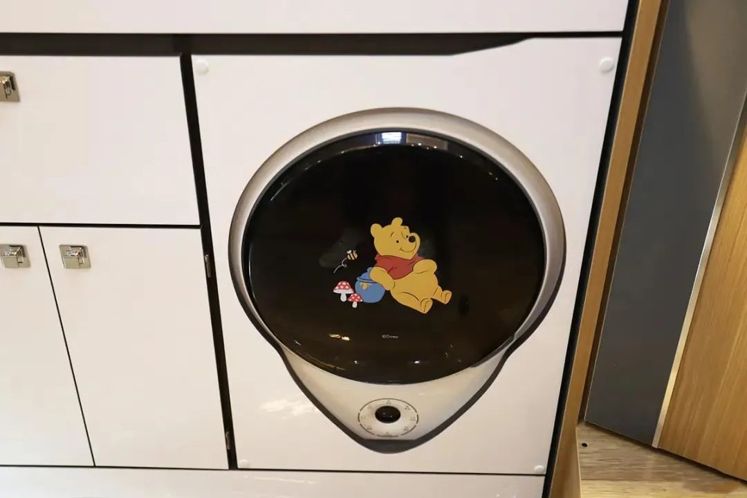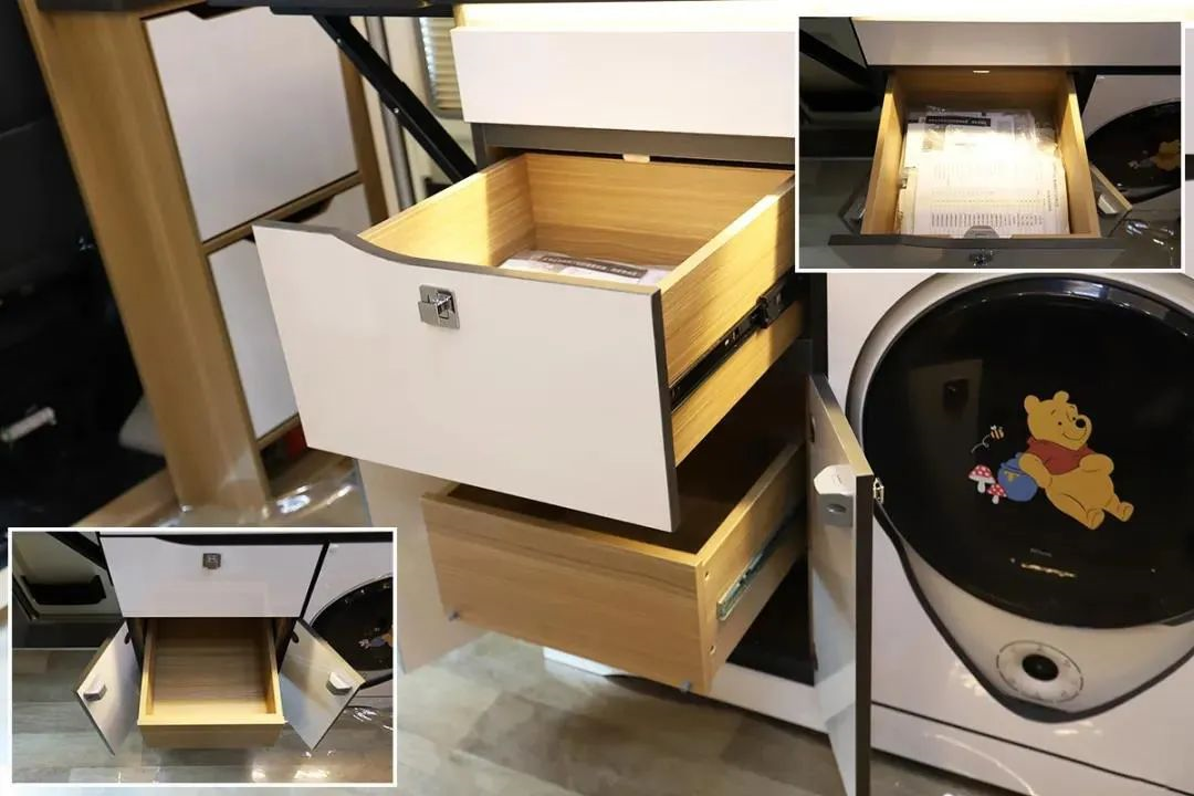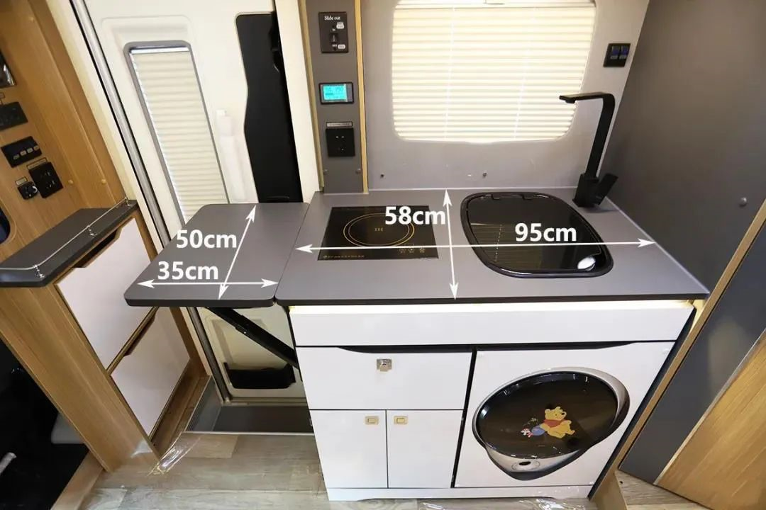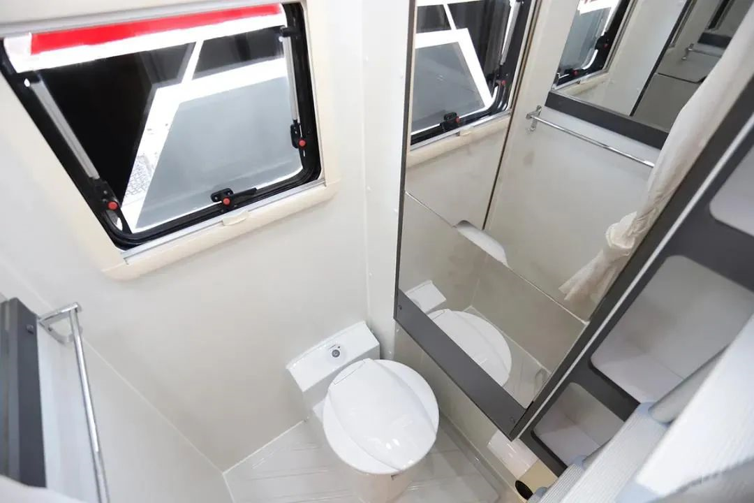 干湿一体式卫浴区配备了折叠面盆、抽拉水龙头、化妆镜、储物柜、多美达马桶、外推窗等设施,解决户外旅行卫浴、洗漱问题;顶部还配备顶置双向换气扇,加快内部空间空气循环。