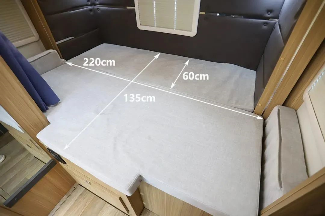尾部休息区设有大尺寸横床,拓展后尺寸可达2200x1350mm,可满足多人睡眠休息;床的三面都设置了车窗,采光通风更有保障;侧面同样设有床帘,保证车内人员休息睡眠不受打扰。