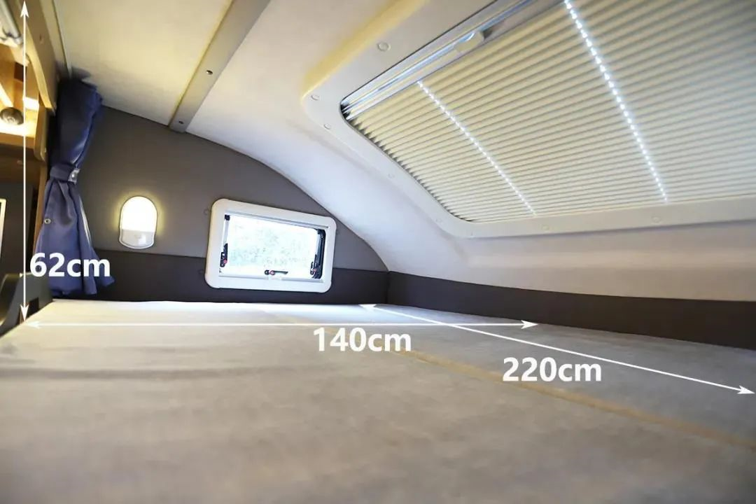 额头休息区位于驾驶室上方,设置了一张1400x2200mm床铺,供日常休息使用;采光通风方面设有大尺寸曲面天窗和两侧小型外推窗,侧面还设有床帘,保证睡眠空间的私密性。