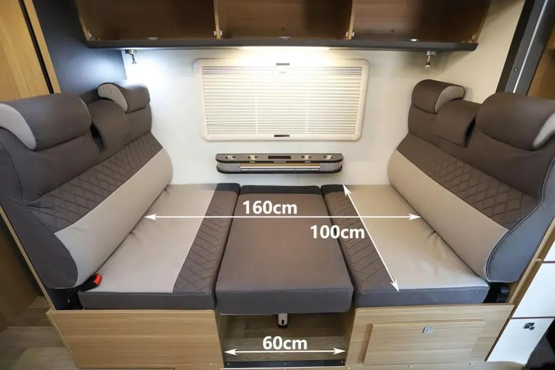卡座中间设置了一张可升降餐桌,与卡座可拼成一张沙发床,增加车内休息空间。