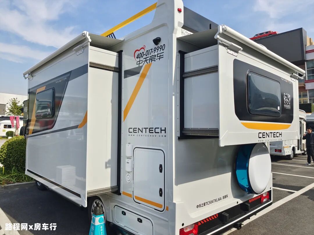 车身左侧和后方均设有拓展机构,驻车后打开可扩大内部使用空间,同时拓展机构上方还设有专门的遮雨棚,防止拓展舱受损。