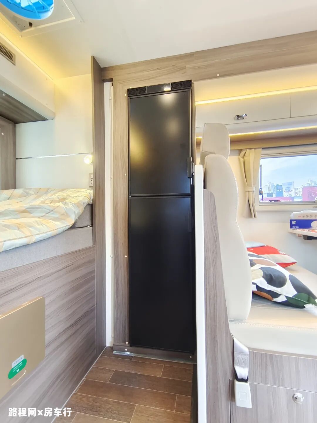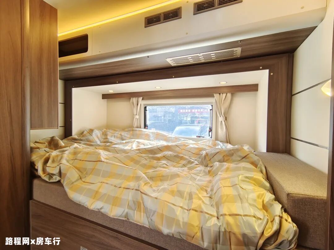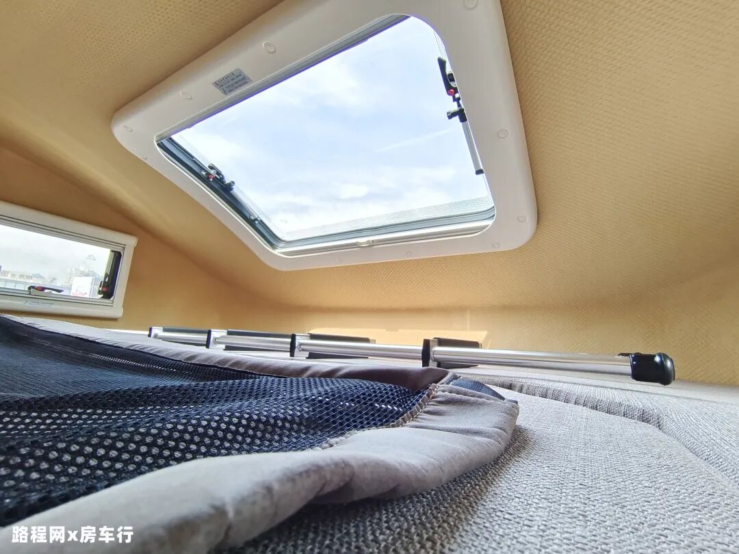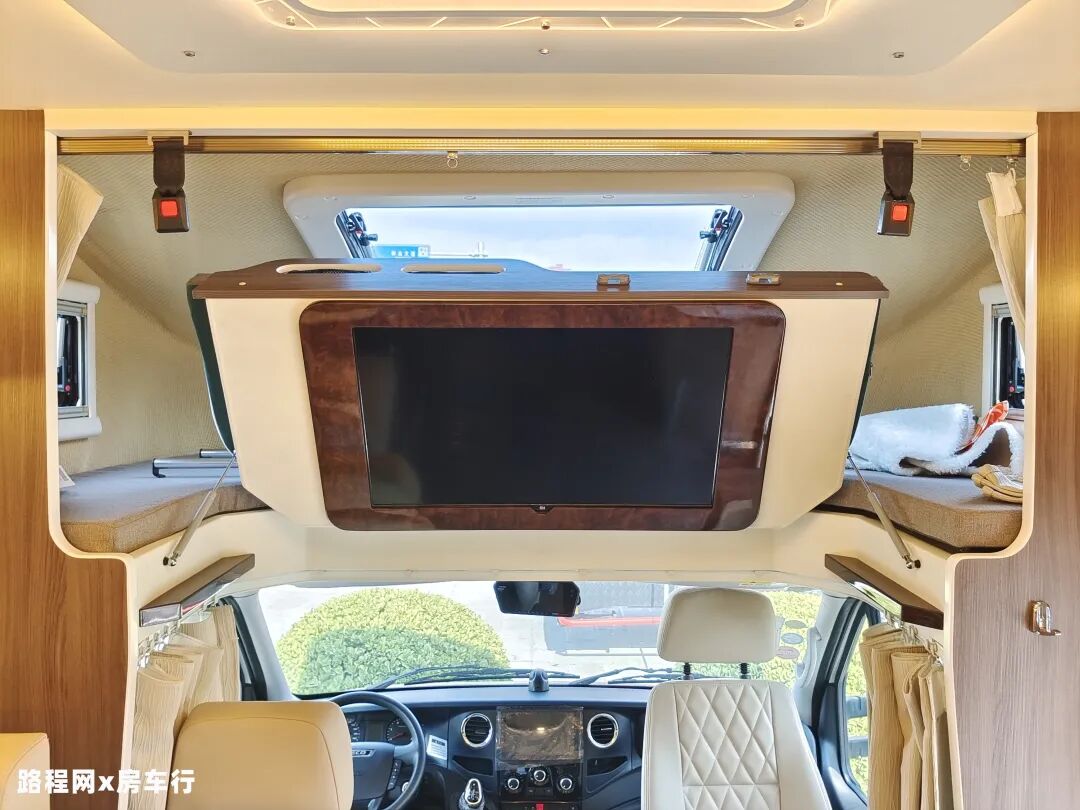 额头床位于驾驶室上方,可满足多人休息使用;窗户设有顶部弧形大尺寸天窗和两侧小尺寸外推窗,方便日常采光通风;床的下方内嵌了一台32寸液晶电视,满足日常观影需求。