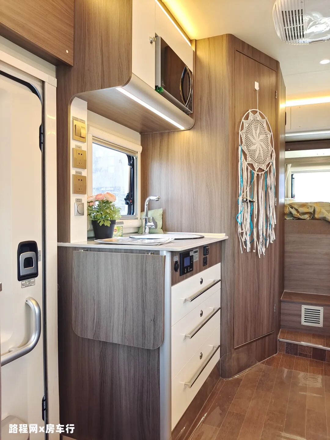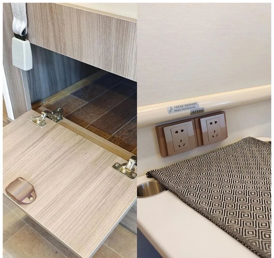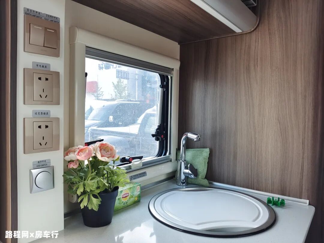 洗菜池上方设有逆变器插座和市电插座,方便电器产品使用,同时还设有踏步开关和灶台灯开关、卫生间灯开关;侧面的外推窗可以在烹饪时打开,散去车内的油烟味。