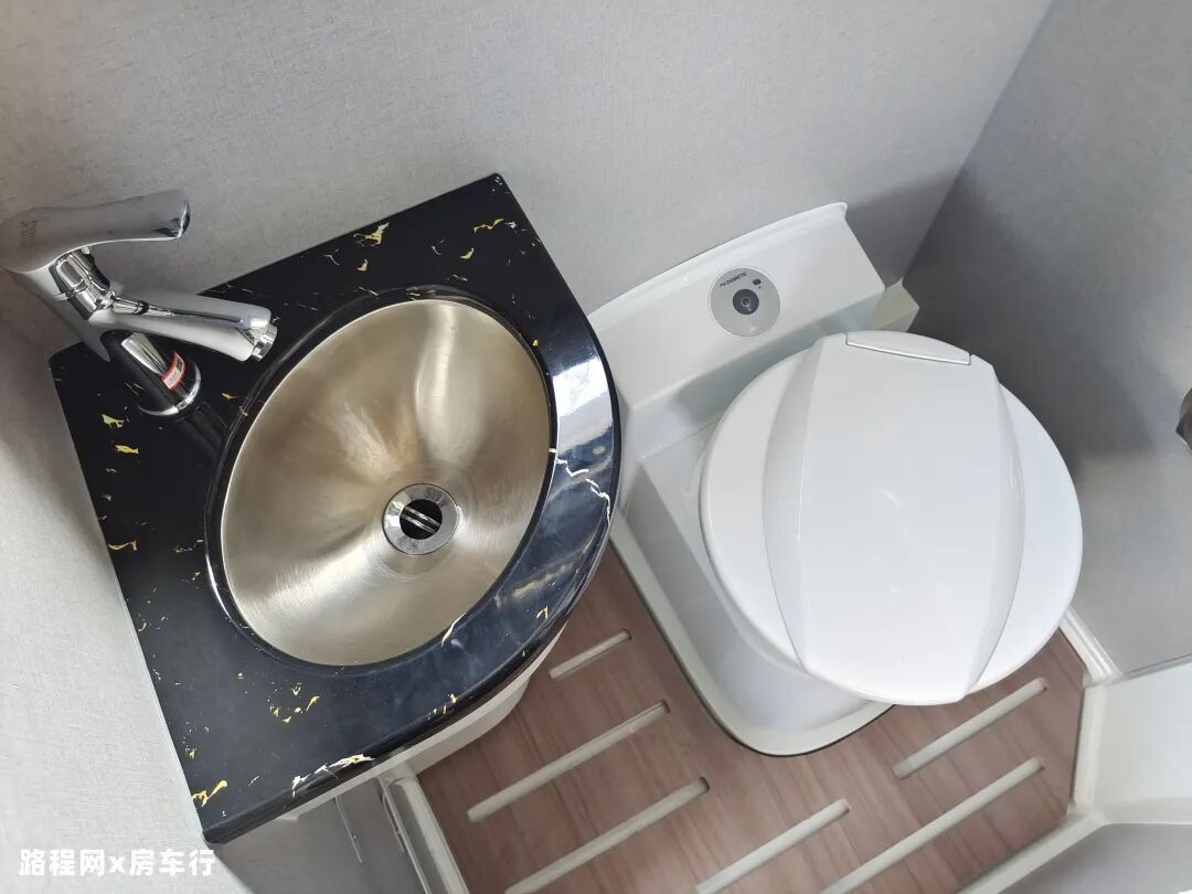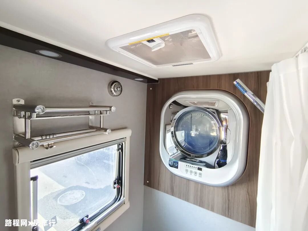 尾部卫浴区采用干湿一体式设计,配备了多美达电动抽拉式马桶、仿人造石手盆台面、梳妆镜、毛巾架、换气扇及独立式淋浴花洒等设施,可满足日常使用;卫生间地面铺设滤水板,防止洗浴时意外滑倒;马桶侧面还设置了一台炜伲雅洗衣机,方便洗涤衣物。