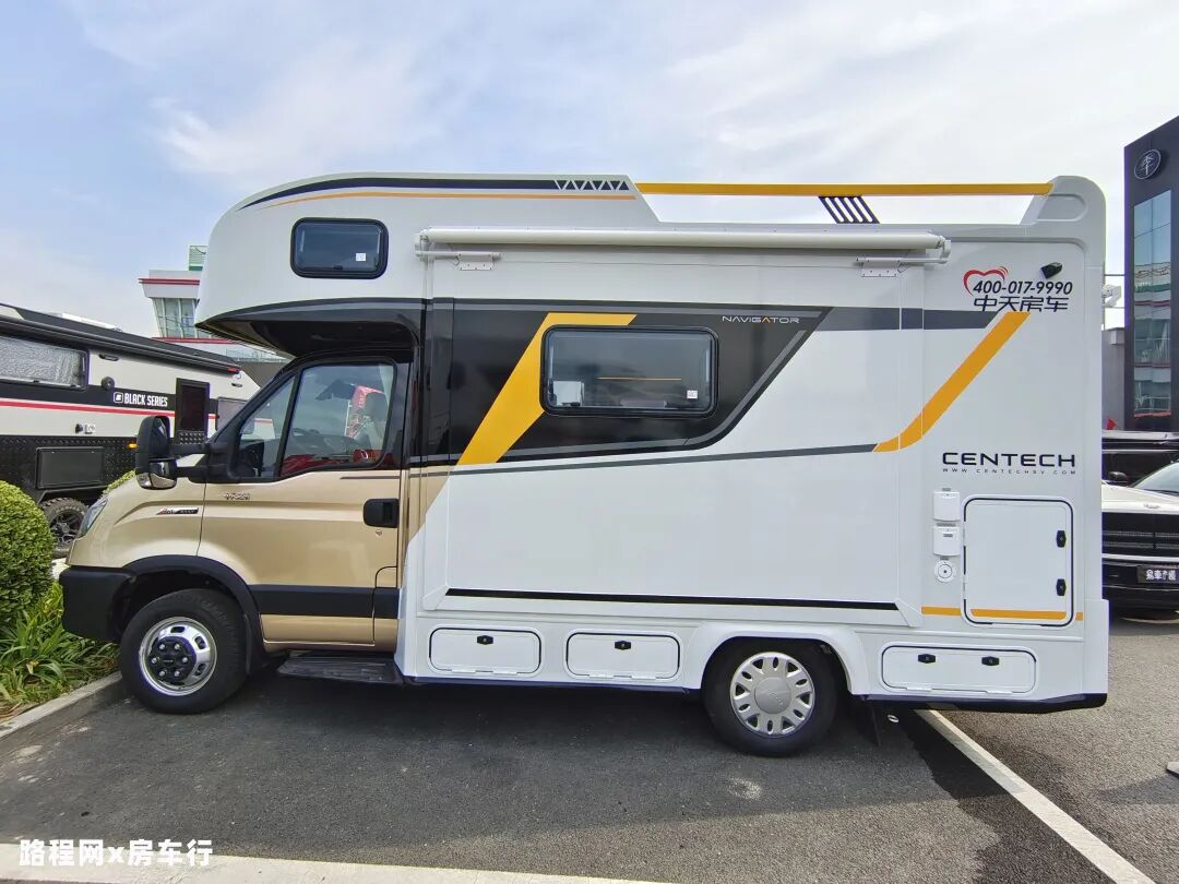 铝板材质的车厢设计,使这款房车在车身质量、强度方面都优于FRP材料;车身外部配备了注水口、市电接口、黑水箱、户外遮阳棚、外部置物台等,可满足户外旅行需求;车尾还设有贯通式储物箱,方便存放旅行用品。