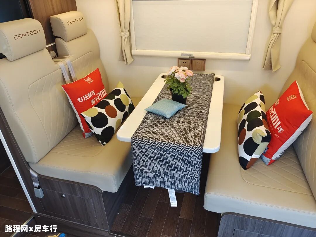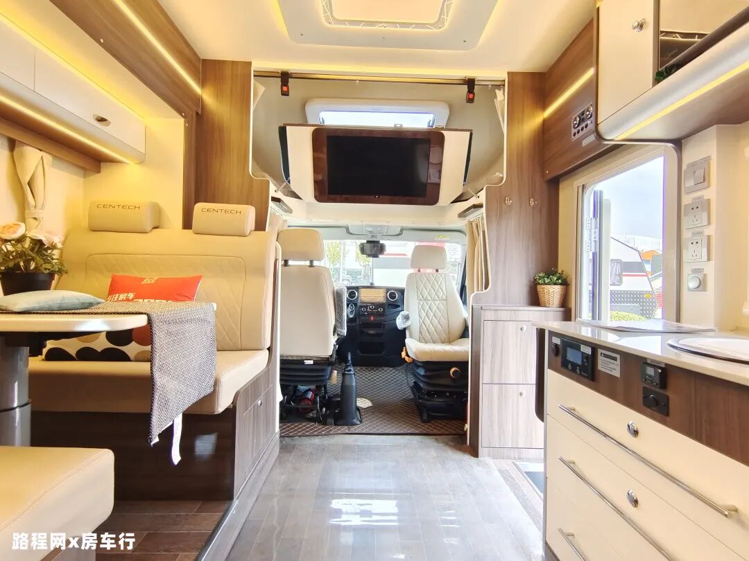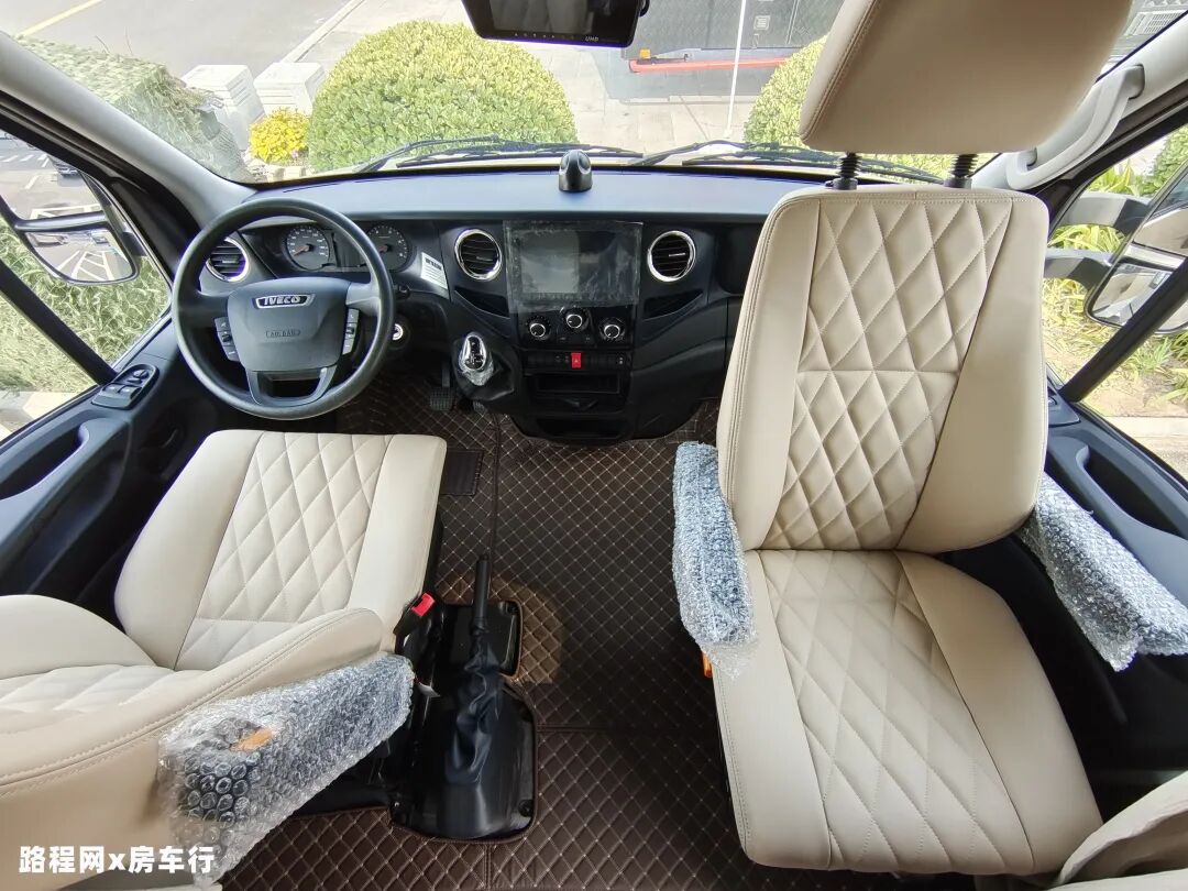 进入驾驶室,可以看到正副驾驶位均配备高级纤维皮革座椅,乘坐非常舒适,副驾驶还可旋转,方便与后方对坐喝茶聊天;行车方面配备了主/副驾驶气囊、中控大屏多媒体系统、定速巡航、五路监控(含限高监控)等辅助驾驶。