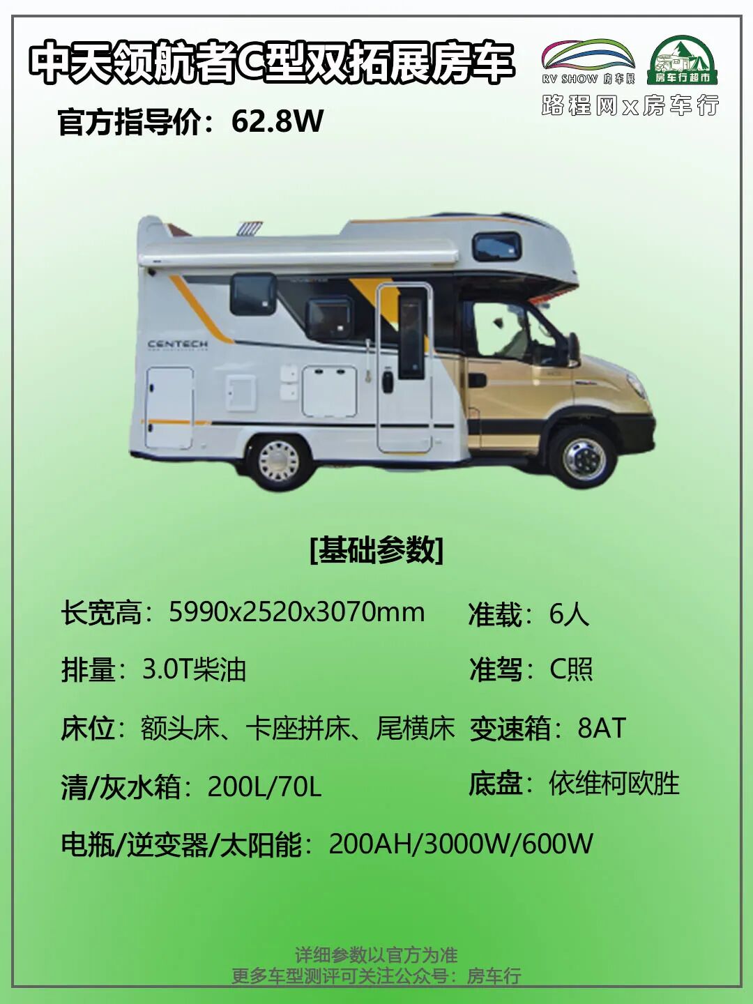综合来看,中天领航者C型双拓展房车不仅配置齐全,在休息空间方面也有不错的表现,能够满足多人旅行。目前,这款房车的官方指导价格为62.8W,大家觉得怎么样呢?欢迎评论区留言讨论!