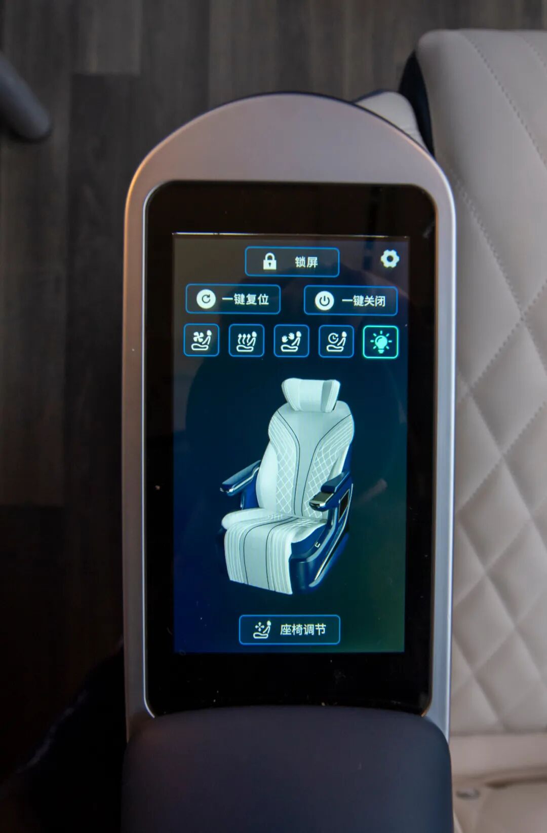 会客区设有两座单人商务座椅,满足日常乘坐需求,副驾驶还可旋转,与后方空间组成更大会客区;座椅中间设有方形餐桌,可作为聊天、办公区使用;侧面设有平推窗,行车时也可以打开,快速更新车内空气;照明系统配备商务高阶大面灯、客厅阅读灯,为夜间生活提供方便。