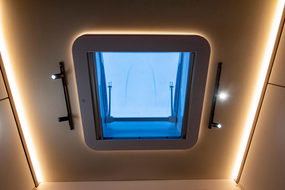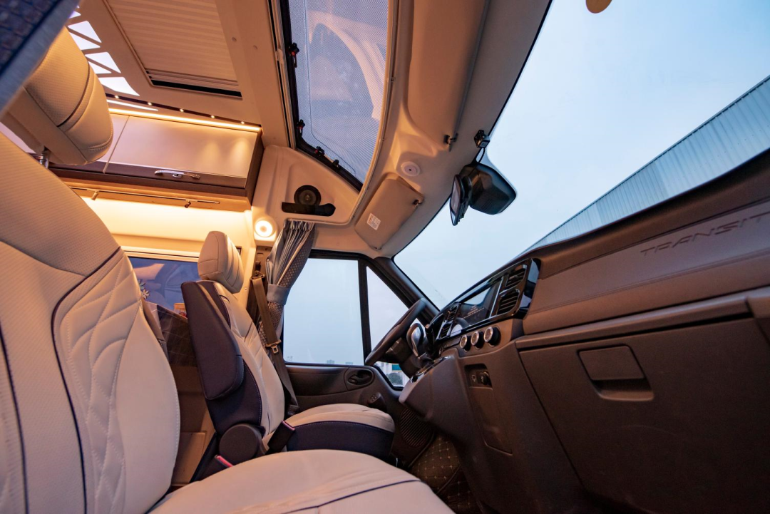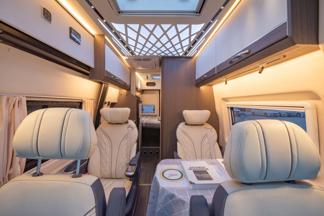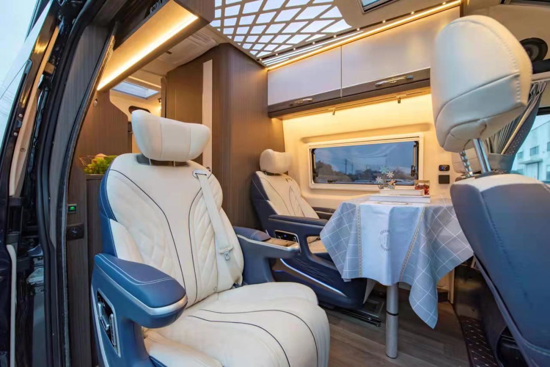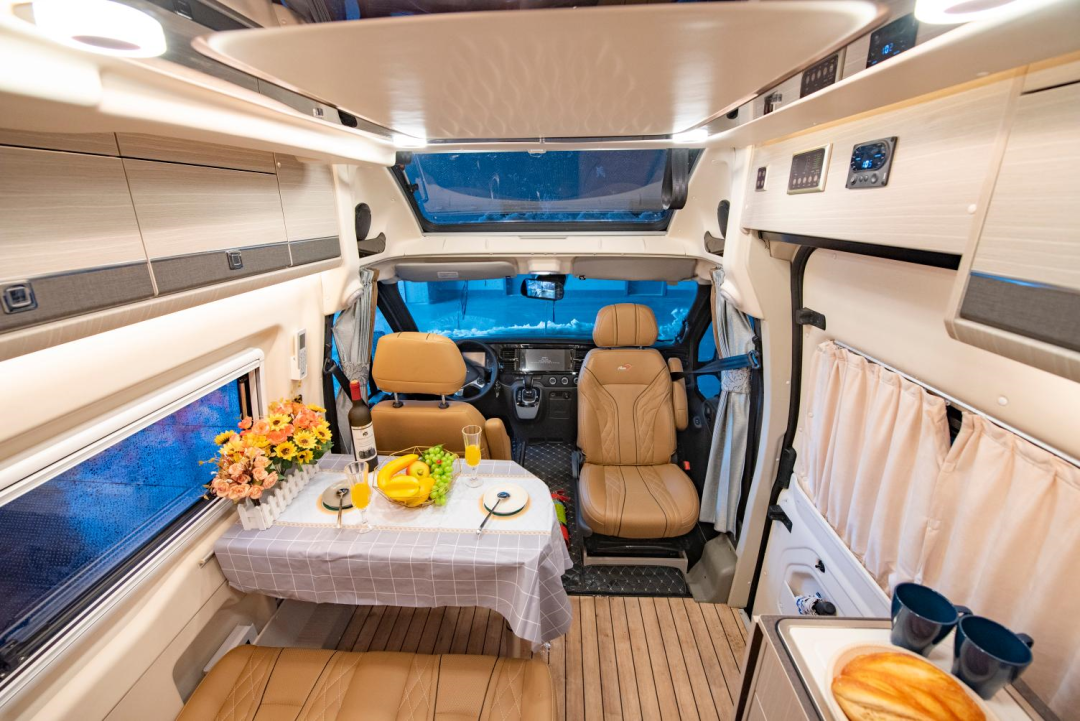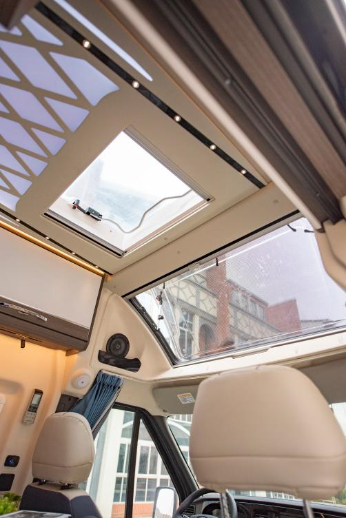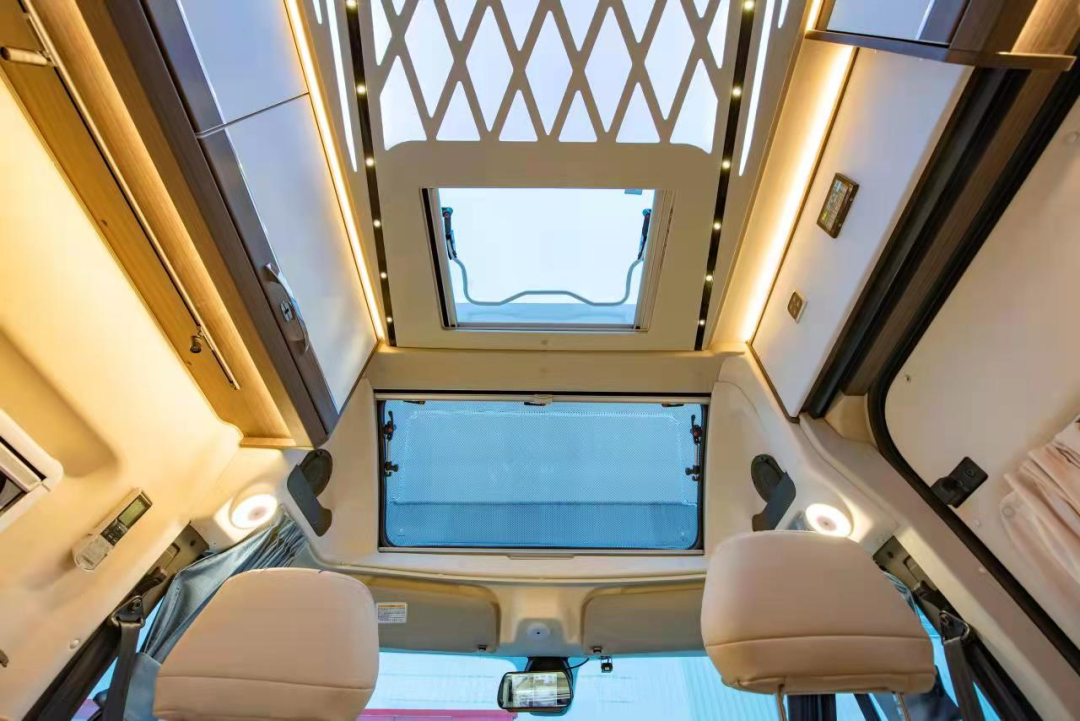 畅旅版会客区采用单排双人座椅设计,顶部设有全景天窗,采光通风效果良好;上方还设有电动吊床,增加车内睡眠空间。