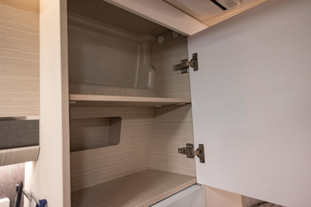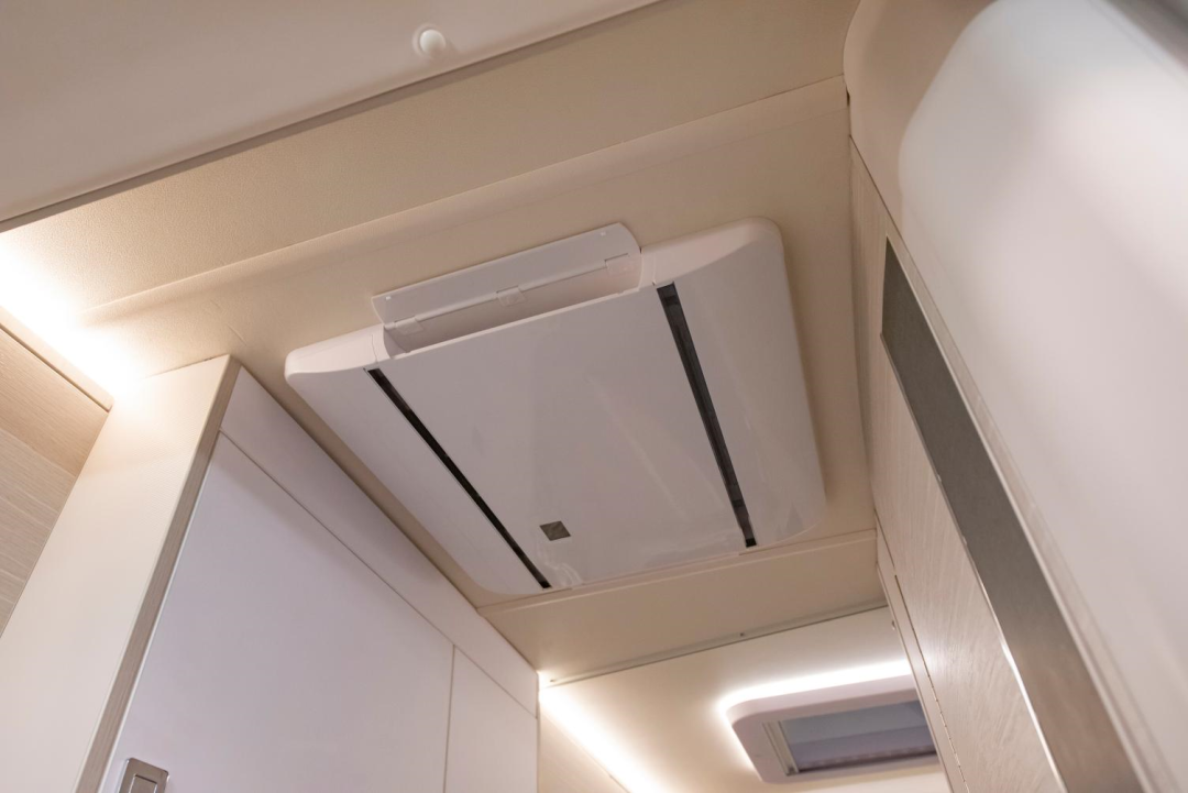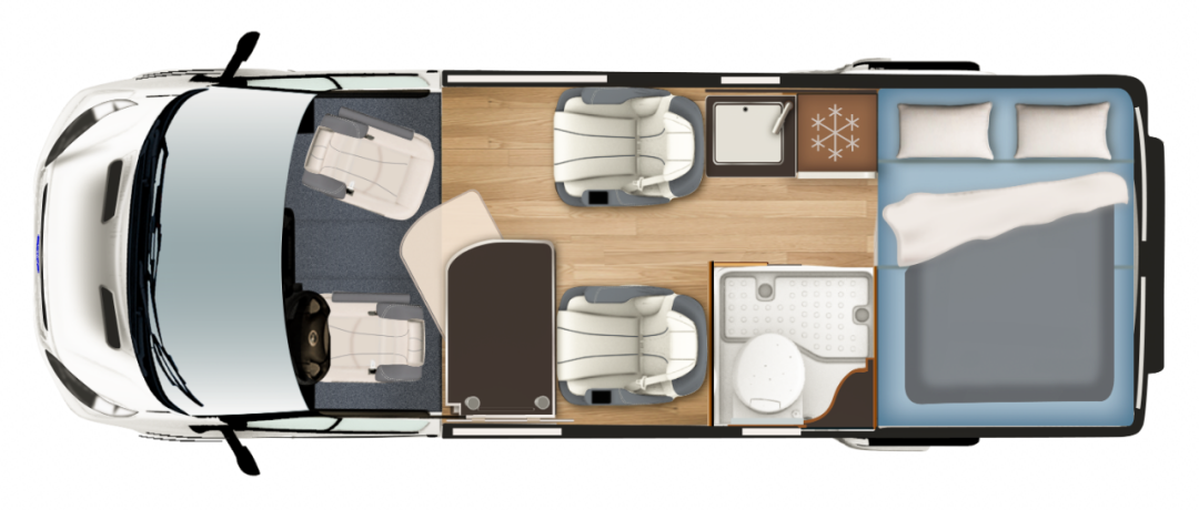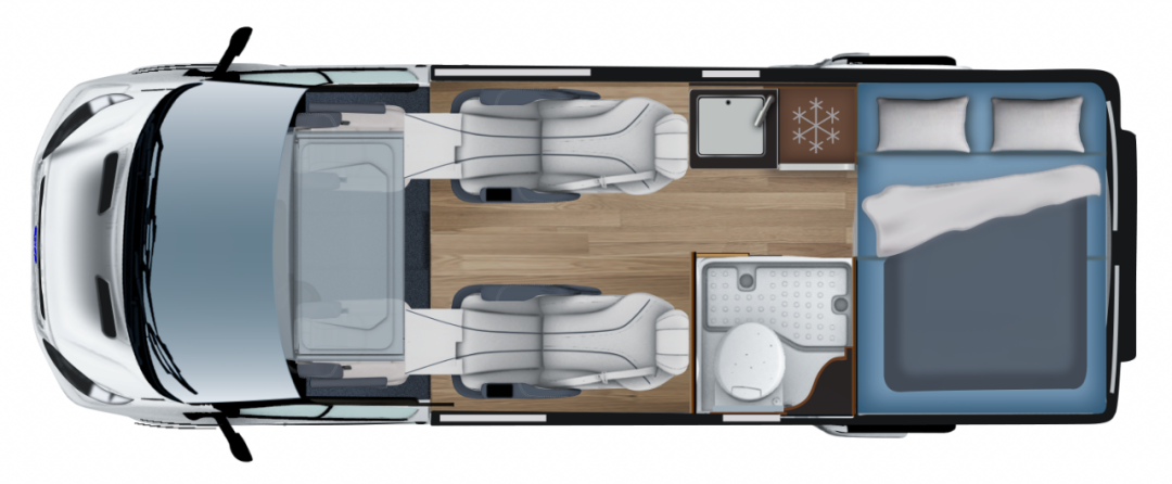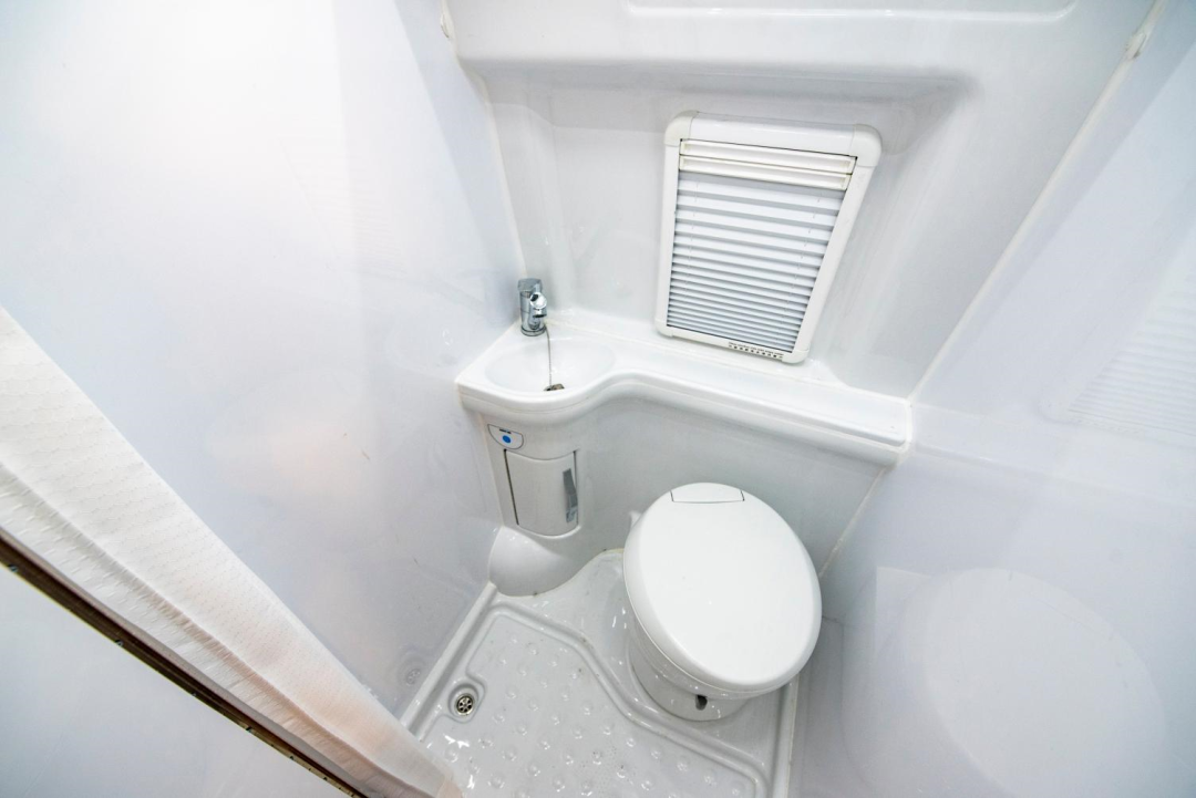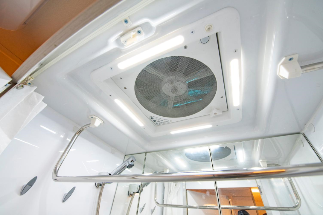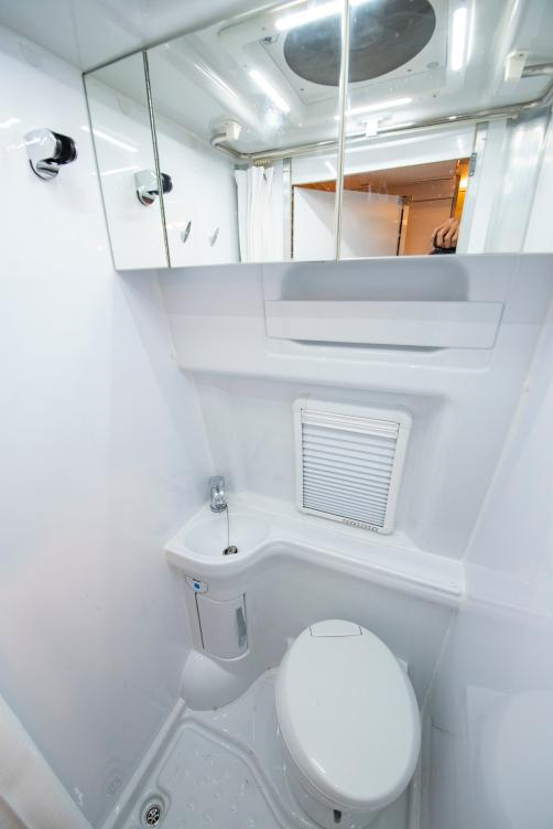 卫浴区采用整体式吸塑防水设计,内部配有淋浴器、进口塞特福德可旋转坐便器、储物柜、化妆镜等设施,满足户外旅行卫浴、洗漱需求。