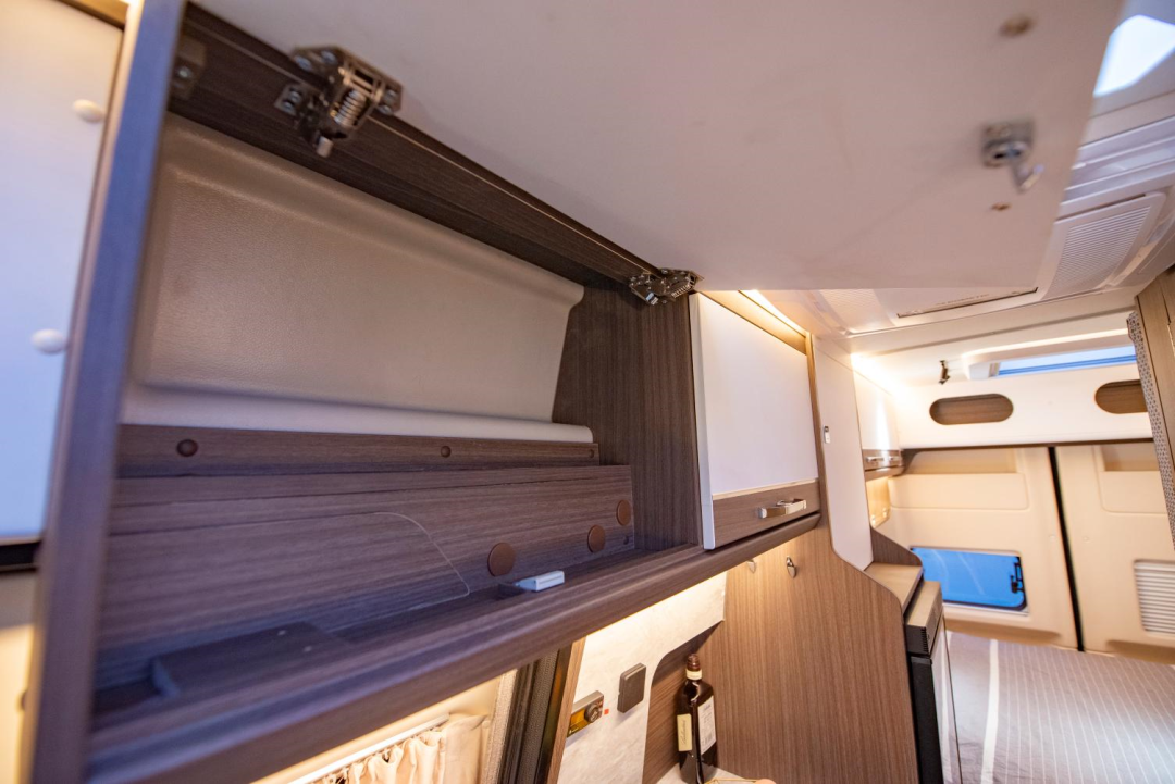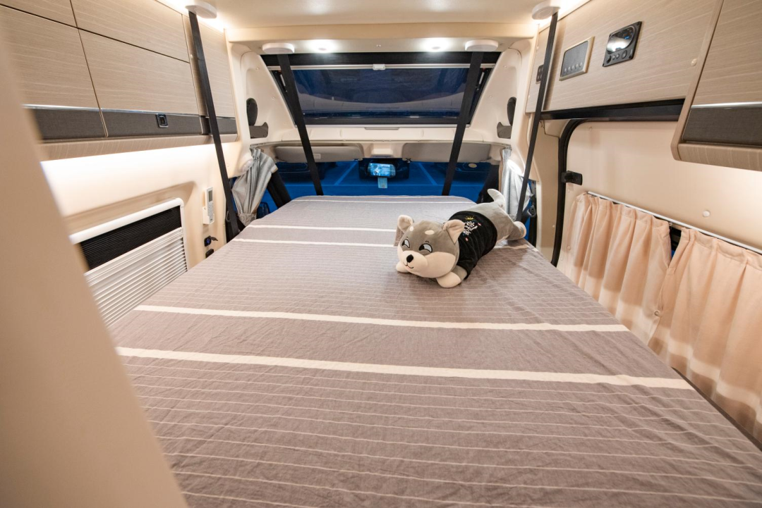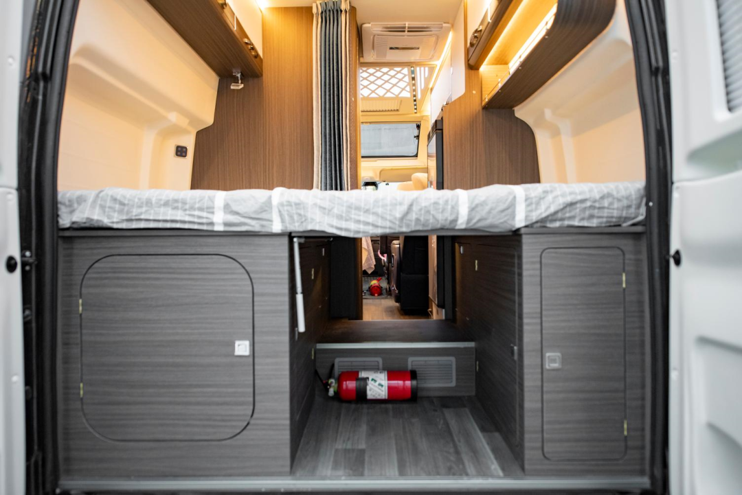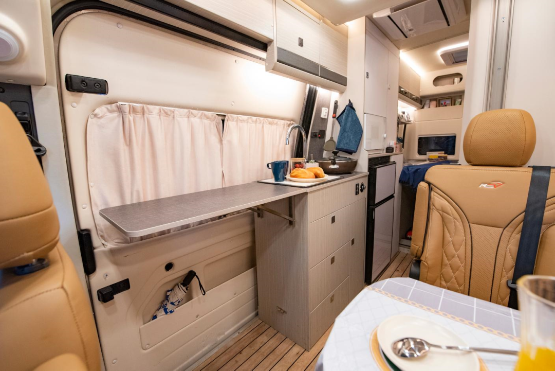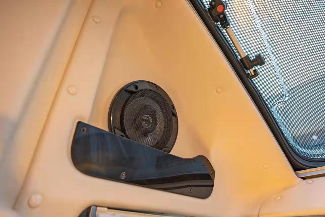生活区前顶、中门等位置均配备隐私拉帘,保证生活空间的私密性;安全方面配备CO/烟雾报警器及2kg灭火器,保证旅行安全;娱乐系统配有原车音响系统+环绕立体声音响,为车友带来更好的影音娱乐体验。