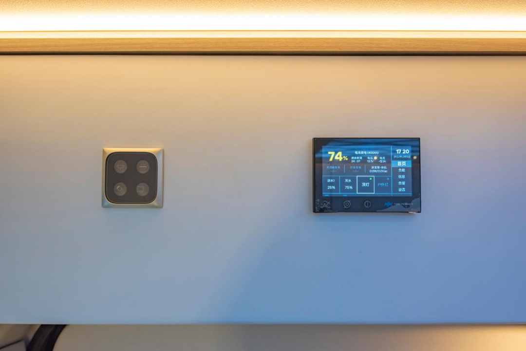 水电方面配备了156L高强度异形PE净水箱、66L高强度异形PE灰水箱、800AH锂电池、3000W充电逆变一体机、220A大功率发动机、手动排污阀、美标食品级进口水路、15M食品级外接加水管、电路保护系统、电源控制箱等,满足户外旅行水电所需。车内还设有锂电控制面板,轻松控制全车水电。