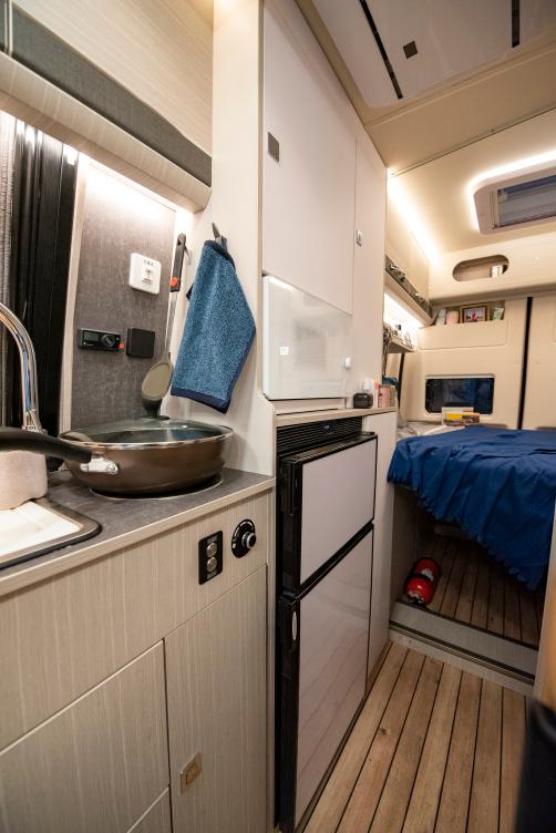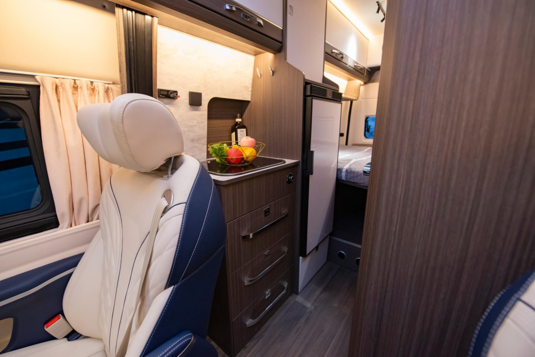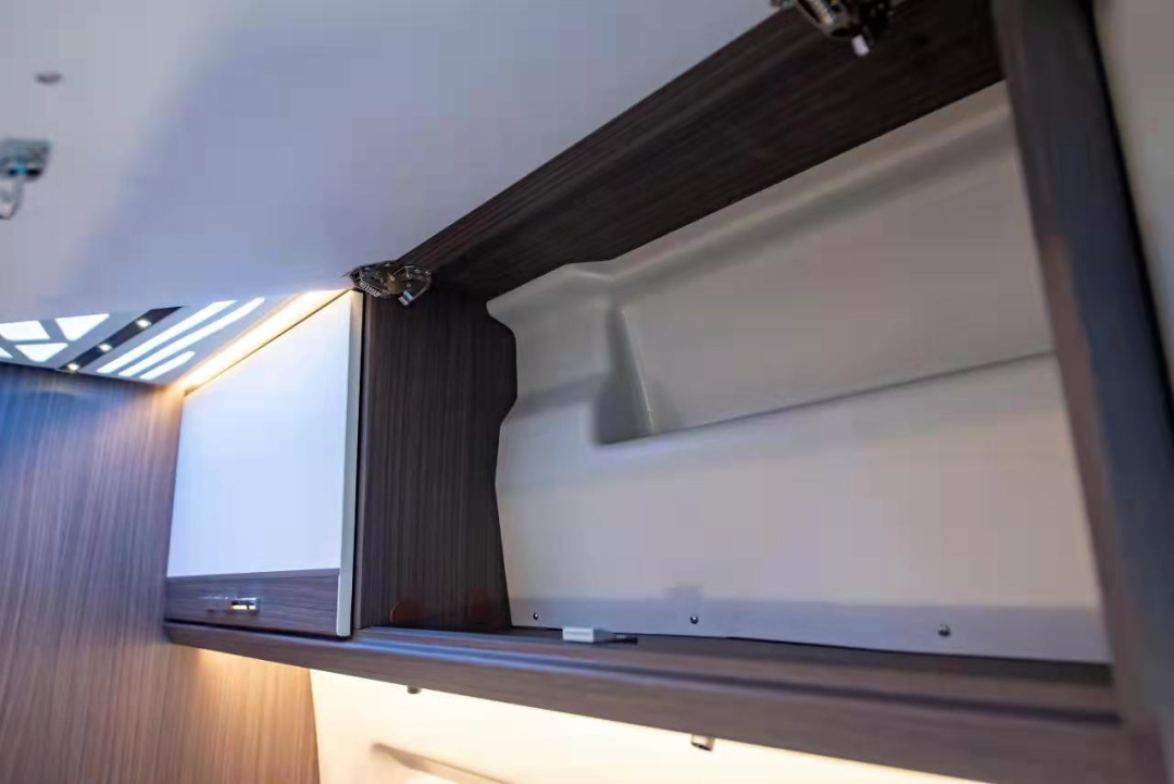 驾驶室后方是生活区,从前往后依次设置了会客区、厨房区、卫浴区、休息区。内饰可选象牙白横纹Cora科技木、尊贵咖竖纹樱桃木设计风格,家具选用E0级环保标家具板材+环保地板革,健康无污染。