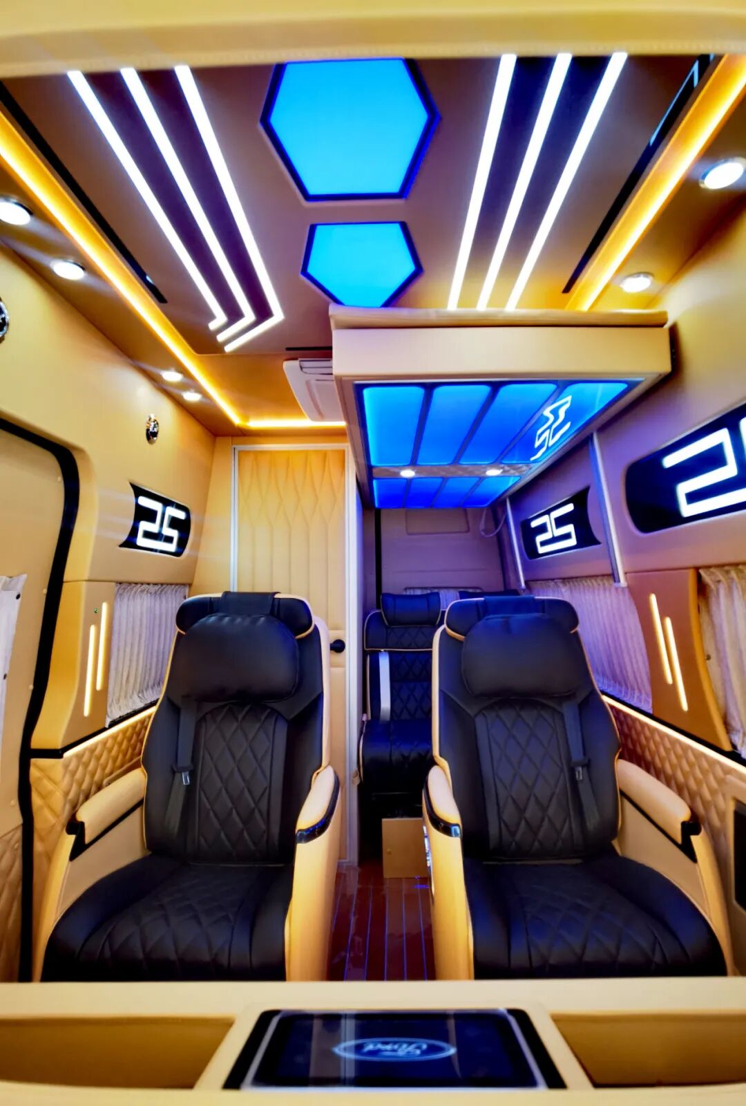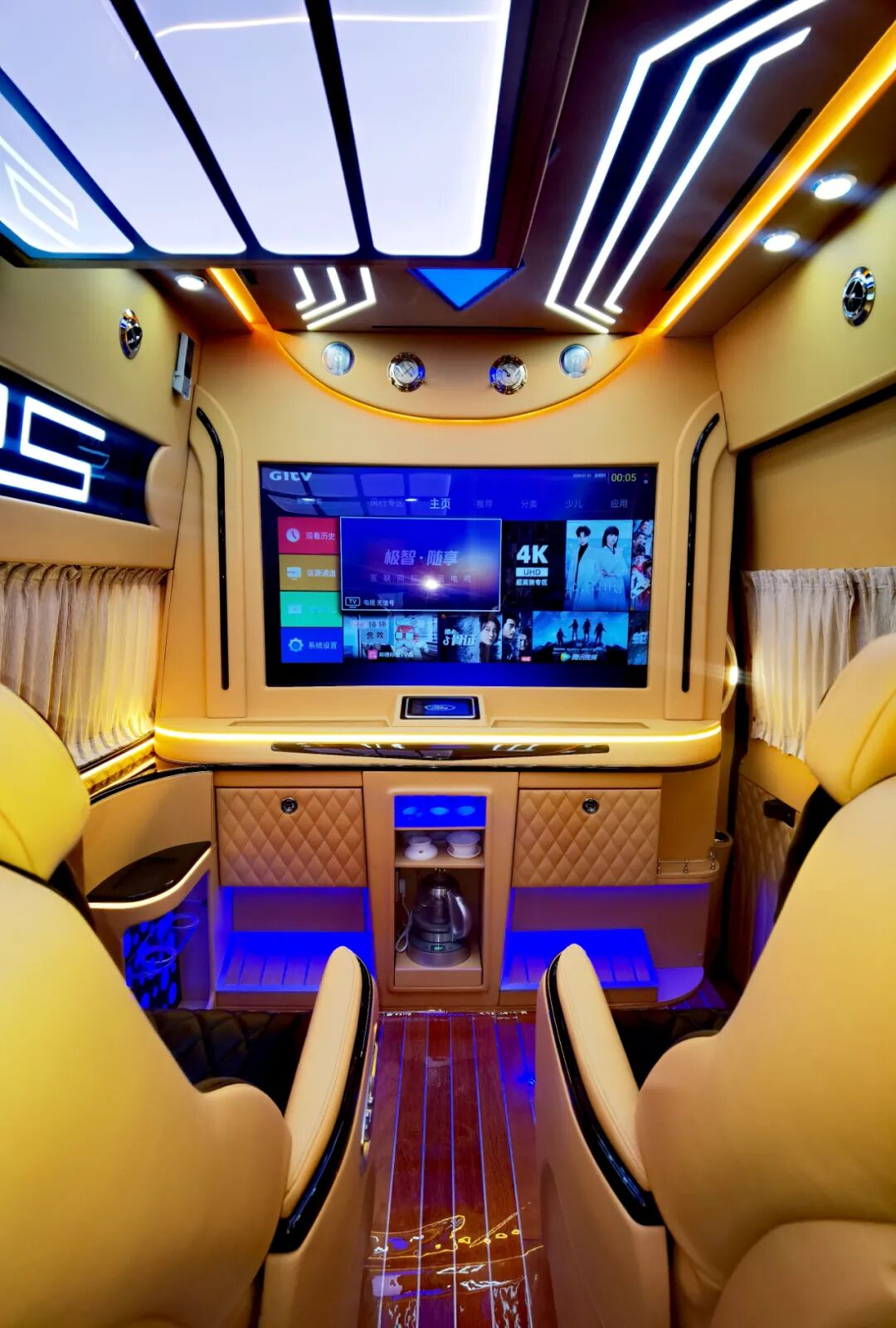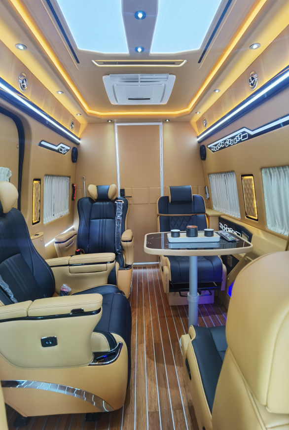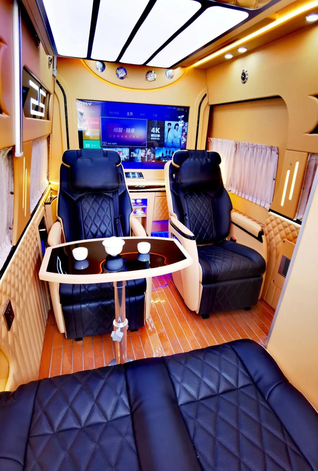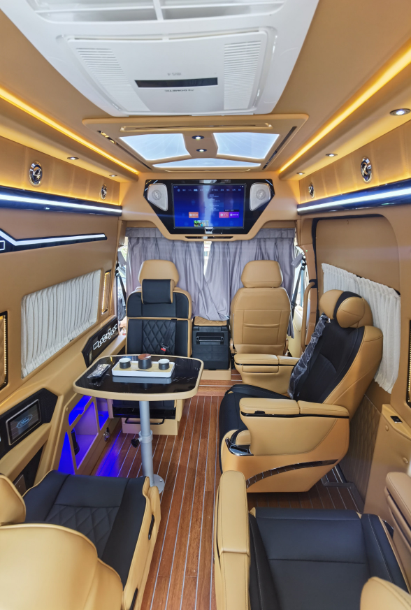 后双人座椅版会客区采用前两座单人座椅+后排双人座椅设计,可满足多人乘坐需求;座椅上方设有电动吊床,休息时可放平沙发座椅,降下升降床,就形成了一个可供休息的睡眠空间。