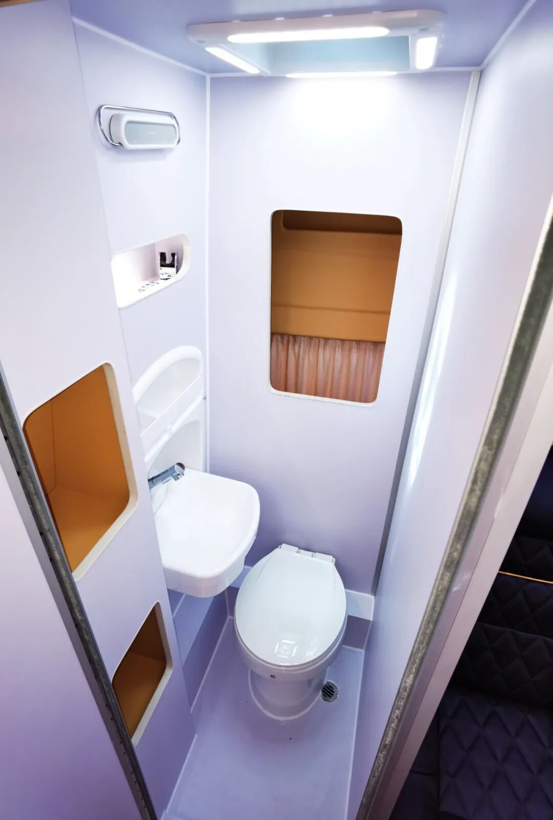 后双人座椅版卫浴区位于会客区后方,采用干湿一体式设计,配备了粉碎直排马桶、折叠洗手盆、独立水龙头、储物格、照明灯等设施,满足日常卫浴、洗漱需求。