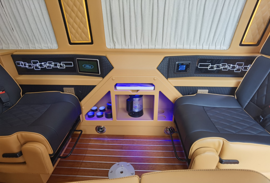 前排单人座椅还可旋转,与后方组成更大会客区;座椅前方设有影音娱乐系统,可满足多样化的娱乐需求;影音系统下方设有分层式储物格及储物柜,用于存放旅行生活物品。