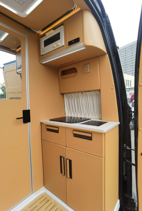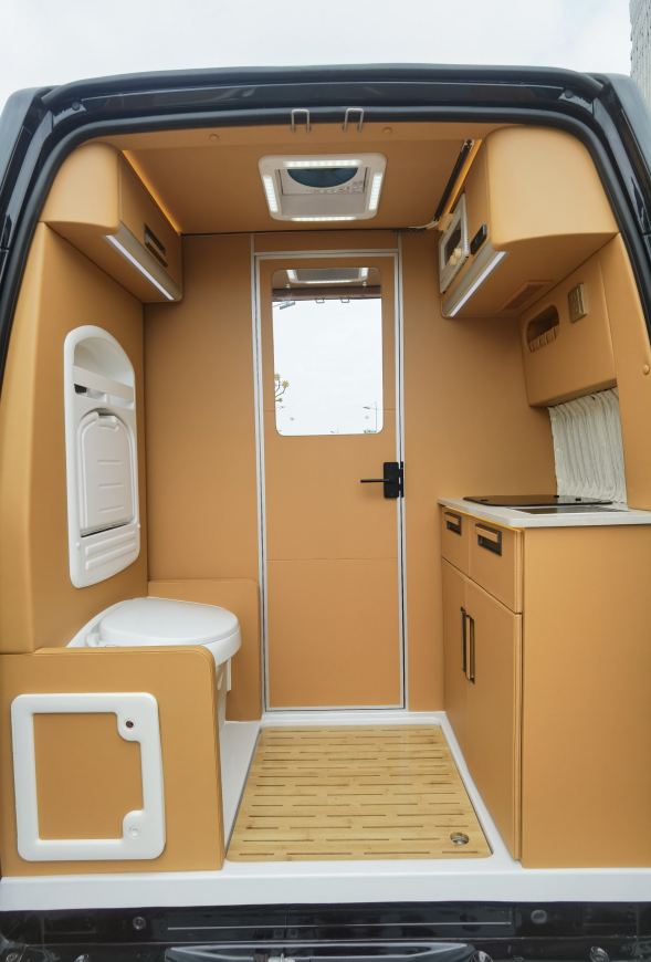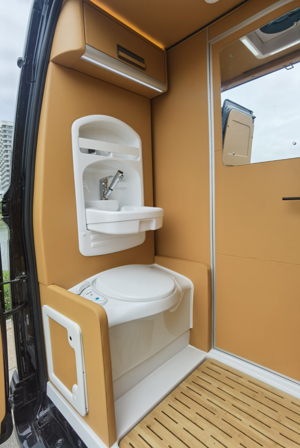 卫浴区设有折叠式洗手盆、独立水龙头、抽拉式淋浴花洒、粉碎直排马桶等,足以解决户外旅行卫浴需求;储物方面设置了内嵌式储物格和顶部吊柜,方便收纳洗漱用品。