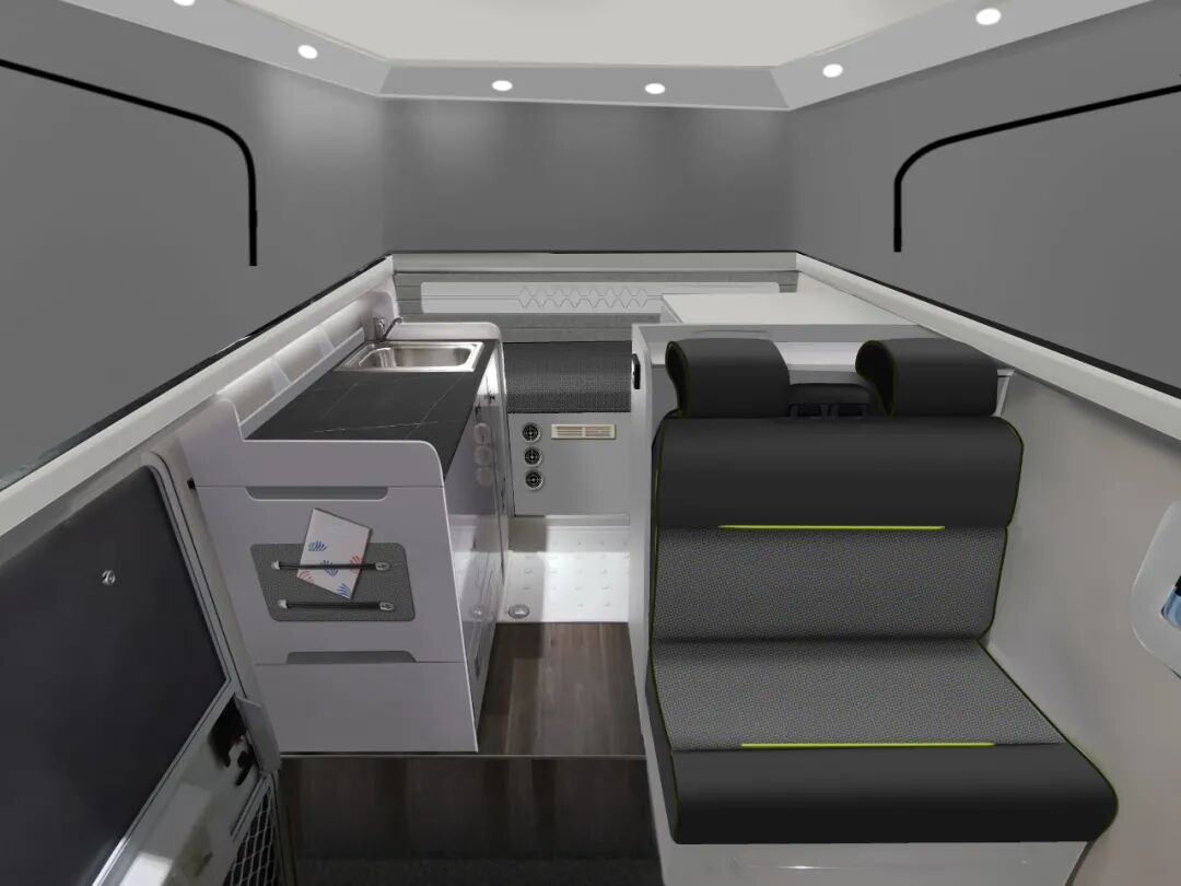 根据申报图展示,车内为驾驶室顶部床位和车尾横置床的基础布局,卫生间采用部分硬隔断连接,升顶状态下,为了保护用户隐私,采用软质防水帘设计。会客区是双人单排布艺座椅,整车核载4人。