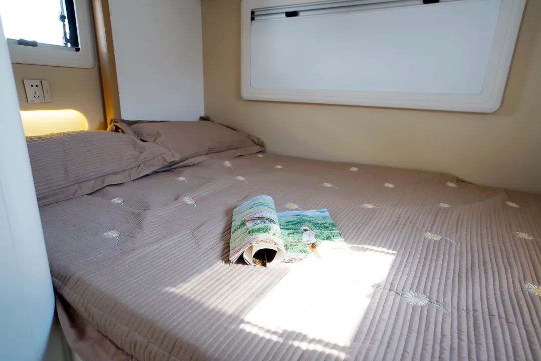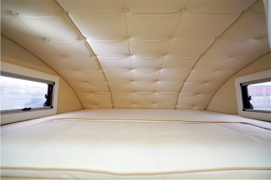 尾部休息区设有单人床,打开拓展舱后变成双人床,可满足多人睡眠休息;床的三面均设有车窗,采用通风效果良好;侧面设有电源插座、床帘,满足充电、私密性等需求。