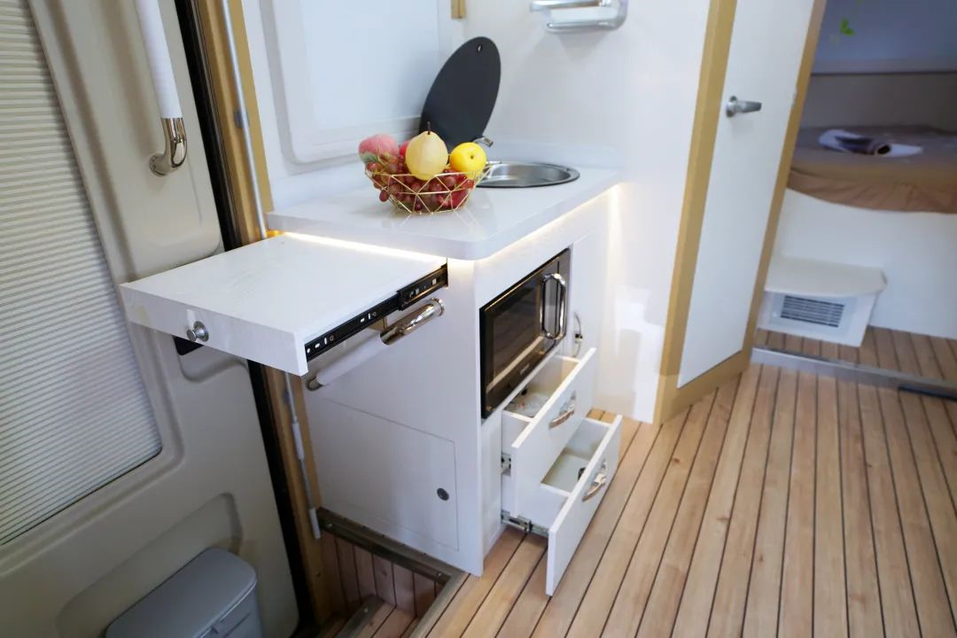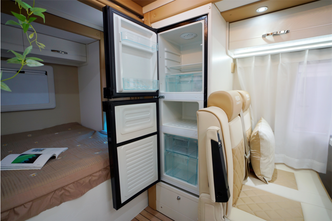 170L车载冰箱位于卡座后方,与厨房区搭配使用。