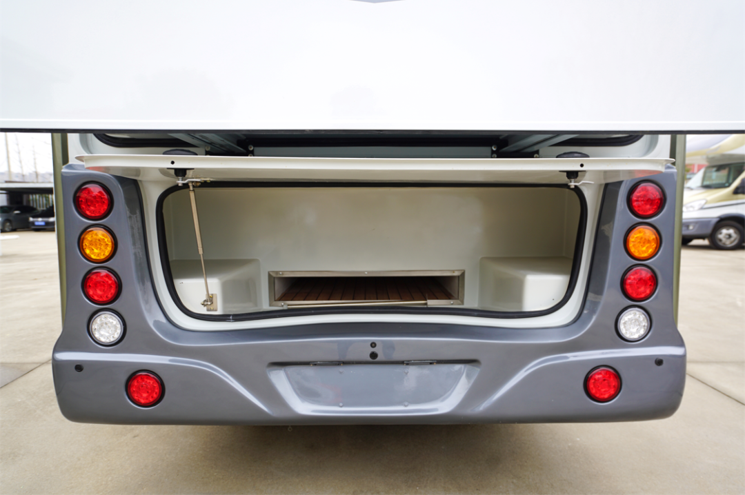 车身外侧设置了充足的储物空间,两侧共设有5个储物舱,方便存放旅行物品;尾部还设置了超大储物舱,能够放下大件行李,下方设有扁状长条入口,与车厢内部贯通。