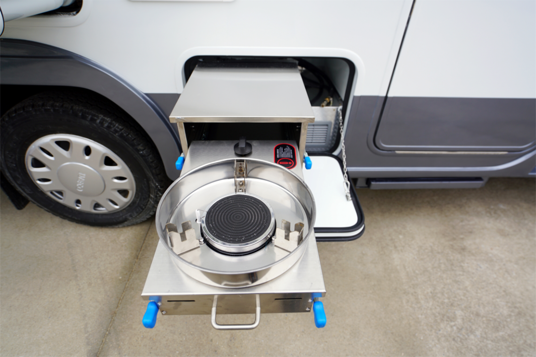 铝合金制板工艺打造的车身,表面光滑,强度高;外侧配备了进口菲亚玛手动遮阳棚、抽拉式单头煤气灶、乘车中门(带储物柜及观察窗、磁吸纱帘)、外部淋浴、户外照明灯、顶部场地照明灯、外市电接口、外接电缆线盘(30米)等,为户外生活提供便利。