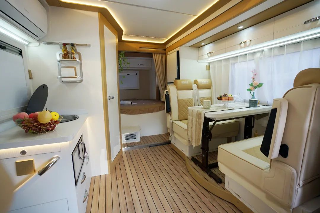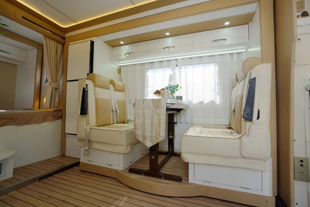 暖风系统配有1.5P家用空调、后行车暖风系统、伟巴斯燃油加热器,保证车内温度适宜;车身左侧会客区、尾部休息区设有拓展舱,驻车后可打开扩展机构,增加车内使用空间。