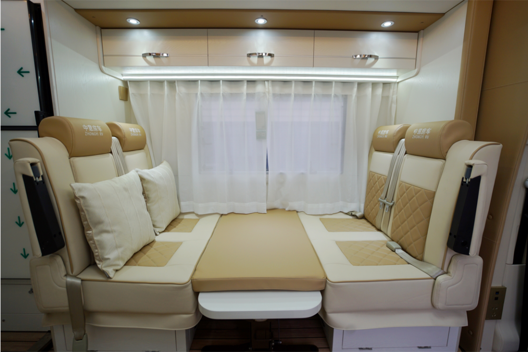 卡座与可折叠餐桌搭配,可以拼成一张沙发床,增加车内休息空间;卡座下方设置了隐藏式储物空间,方便存放一些日常使用物品。