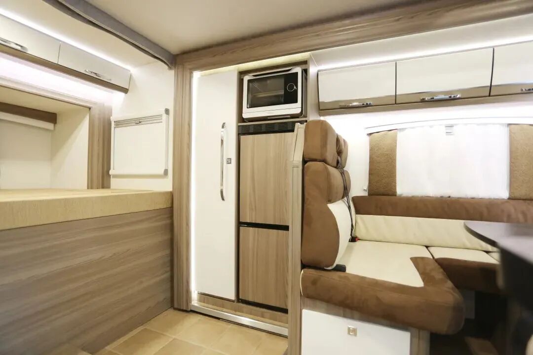 ● 厨房区配备储物抽屉、盖板洗菜盆、微波炉、和148L车载冰箱;周边还有24寸的飞利浦网络电视以及鞋柜;