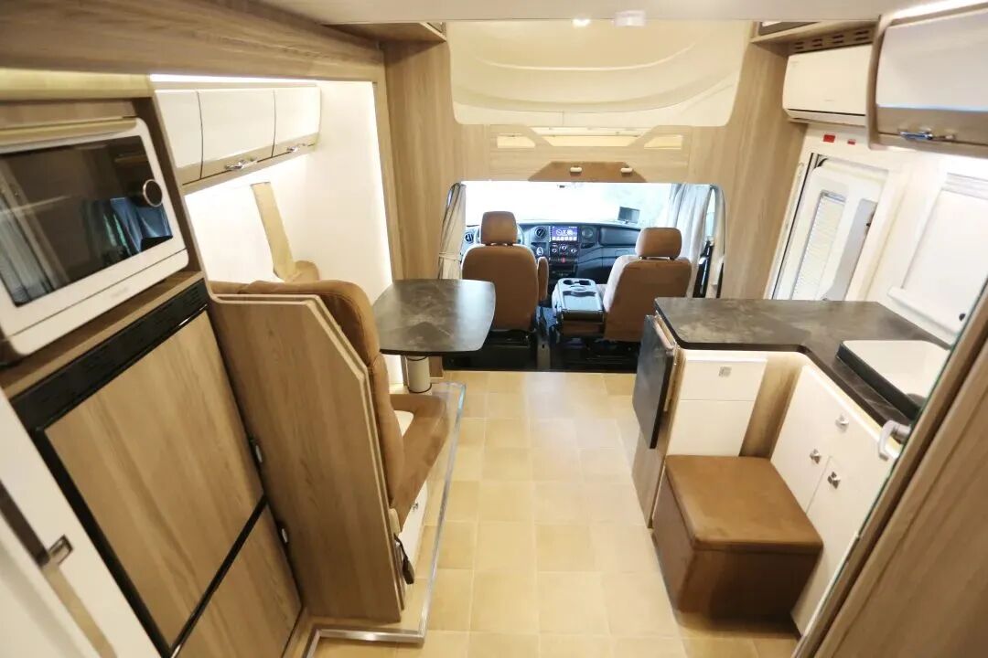 ● 车内休息区是L型卡座沙发+升降桌+外推窗+窗帘+储物吊柜的设计,主副座椅可旋转与之形成完整的会客区;