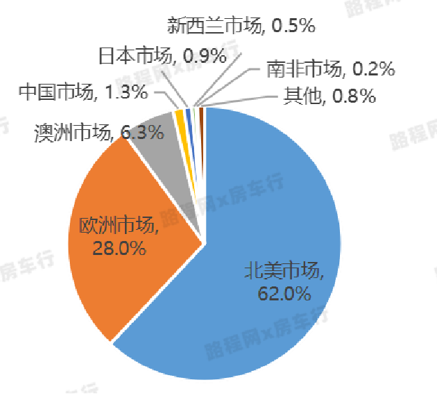 根据路程网x房车行相关数据统计,截至2021年底,全球房车市场整体保有量超2200万辆,其中北美(美国及加拿大)、欧洲占据全球房车消费市场90%以上的份额,澳洲市场以6.3%的占比排名第三,中国市场仅占比1.3%。同时根据消费结构不同,全球房车市场大致可分为以拖挂式房车为主、以自行式房车为主两大类别。