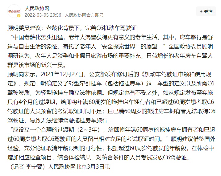 不过这里有个好消息要告诉大家,在今年两会上,全国政协委员 顾明 提议:在老龄化背景下,完善C6机动车驾驶证。应设立一个合理的过渡期(2~3年),给即将年满60周岁的拖挂房车拥有者和已超过60周岁想考取C6驾驶证的人员留出相对充足的考试取证时间。