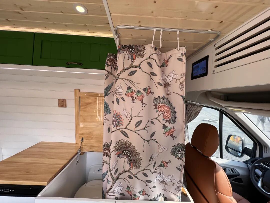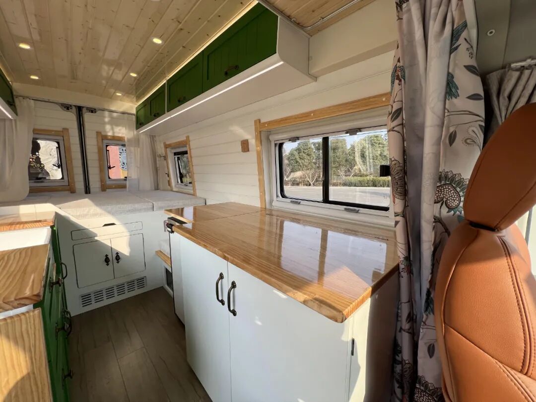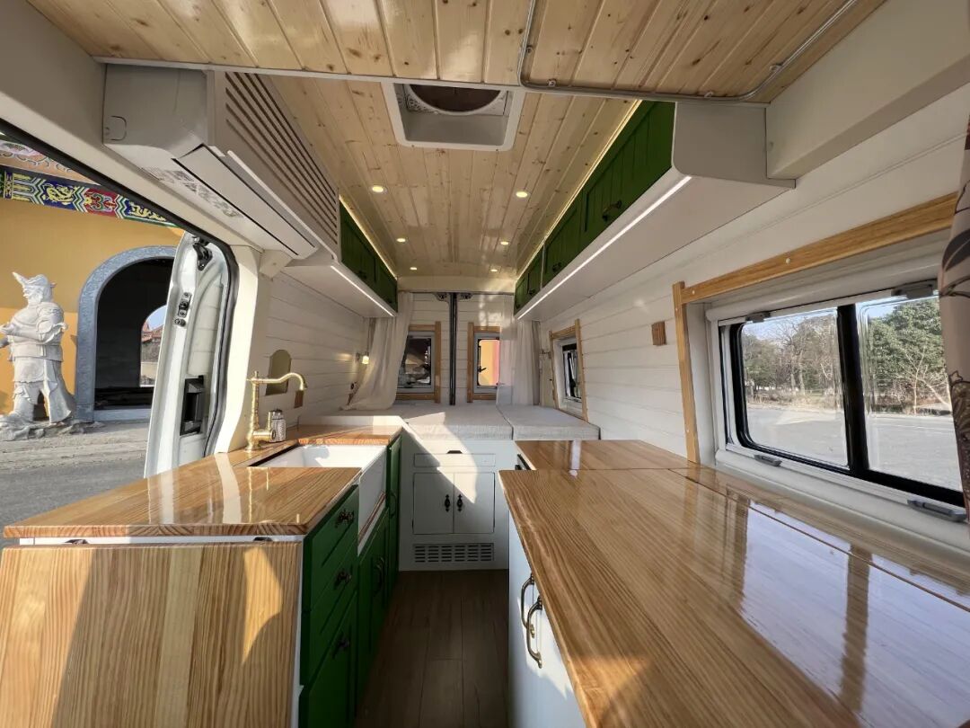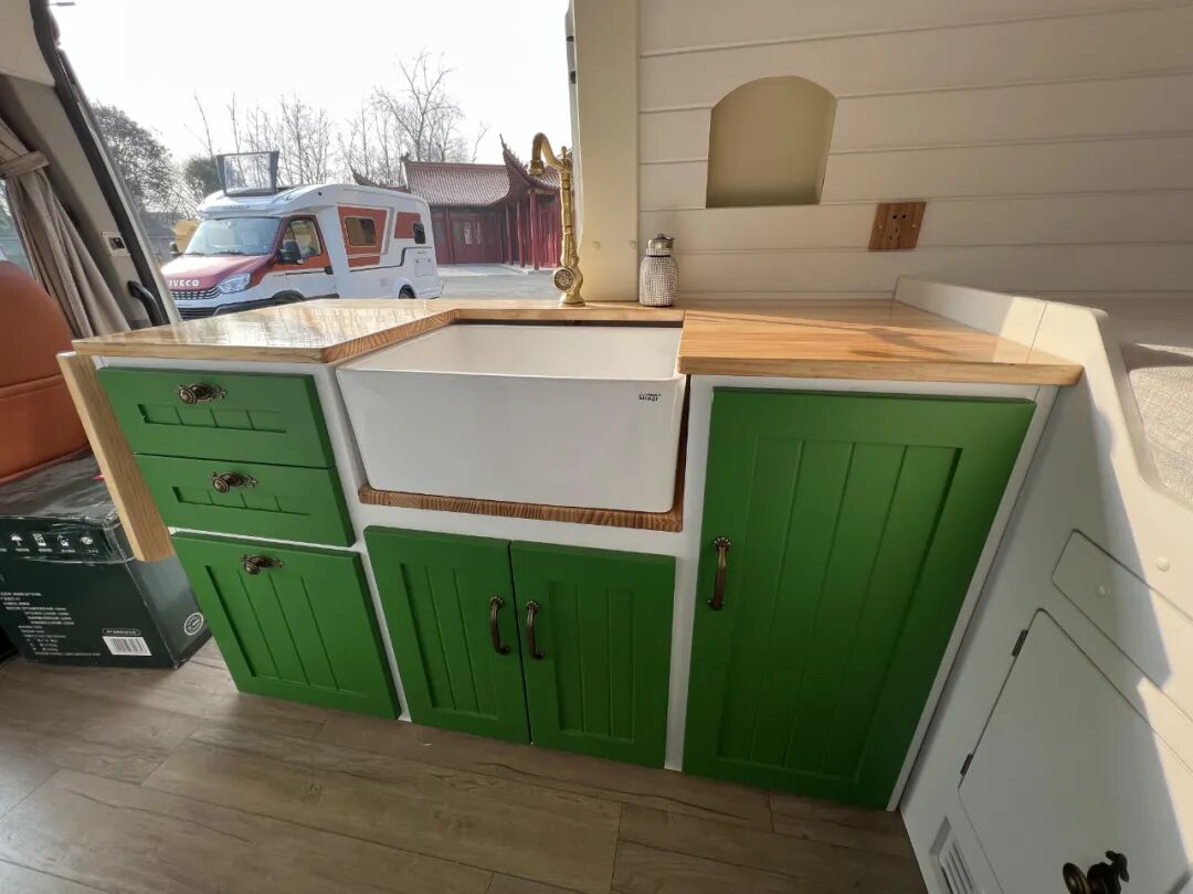 驾驶室后方是生活区,采用全新布局设计,将卫浴区设置在柜体内,使整个空间更加通透,同时也让尾床空间更加宽敞;内饰设计采用亚光白板材,柜门及抽屉门为绿色实木,质感细腻,环保无污染,搭配浅色地板革、纯白护墙板装饰,营造出温馨的旅居氛围。
