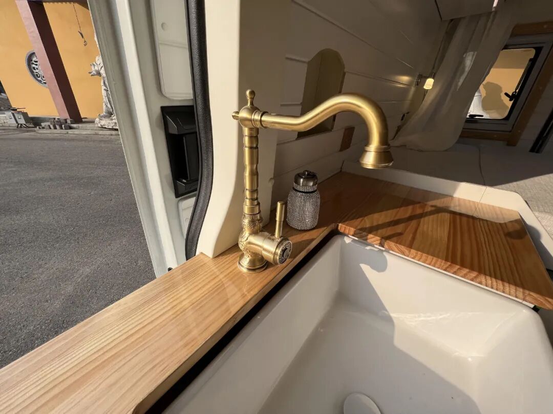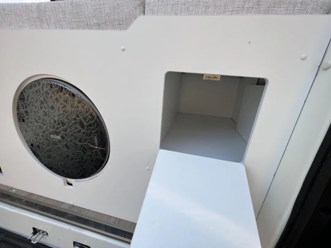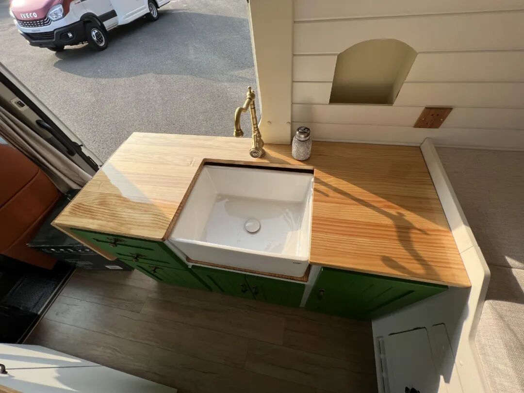 与一般B型房车不同的是,这款房车在原车会客区位置设置了柜体式卫浴区,台面可向上翻起后(安装气动撑杆),即可使用卫浴设施。