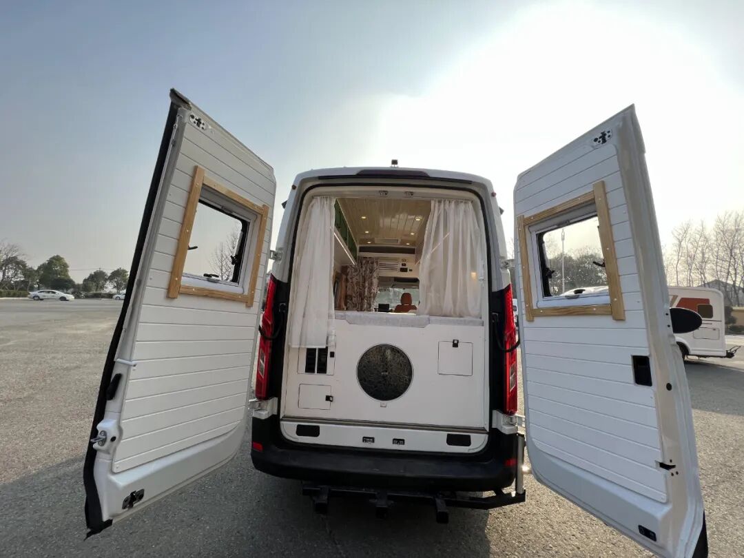 打开尾门后,可以看到生活区尾部设置了白色纱帘,保护车内隐私。