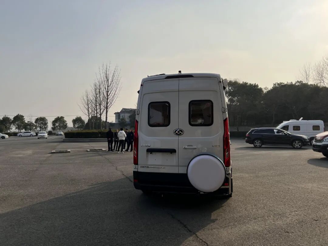 这款房车外观采用白色涂装,与大气的一字型贯通装饰灯、横技进气栅格前脸搭配,简约又不失时尚;由于车内未设置会客区,行车时仅主副驾驶室可乘坐,准载人数为2人。